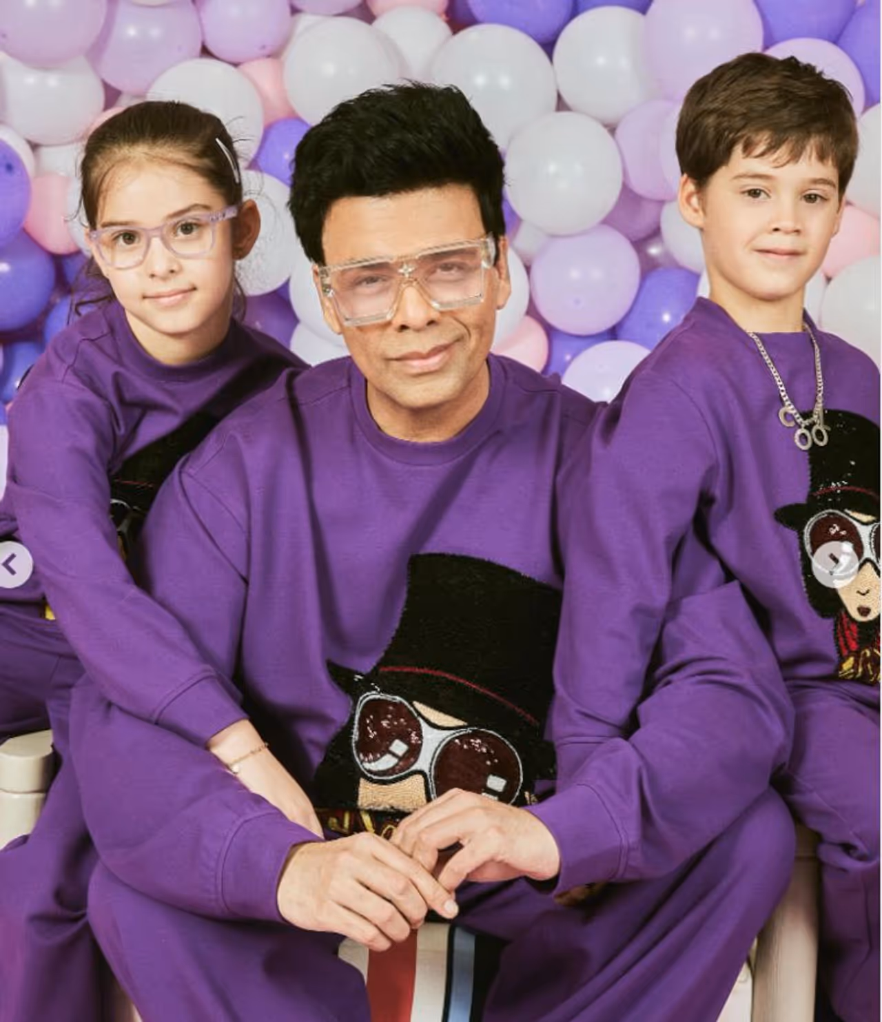 ತಮ್ಮ ಇಬ್ಬರು ಮಕ್ಕಳು ಹಾಗೂ 81 ವರ್ಷದ ತಾಯಿಯ ಜೊತೆಗೆ, ನೇರಳೆ ಬಲೂನ್ಗಳ ಜೊತೆ ನಿಂತಿರುವ ಫೋಟೋಗಳನ್ನು ಕರಣ್ ಹಂಚಿಕೊಂಡಿದ್ದಾರೆ.