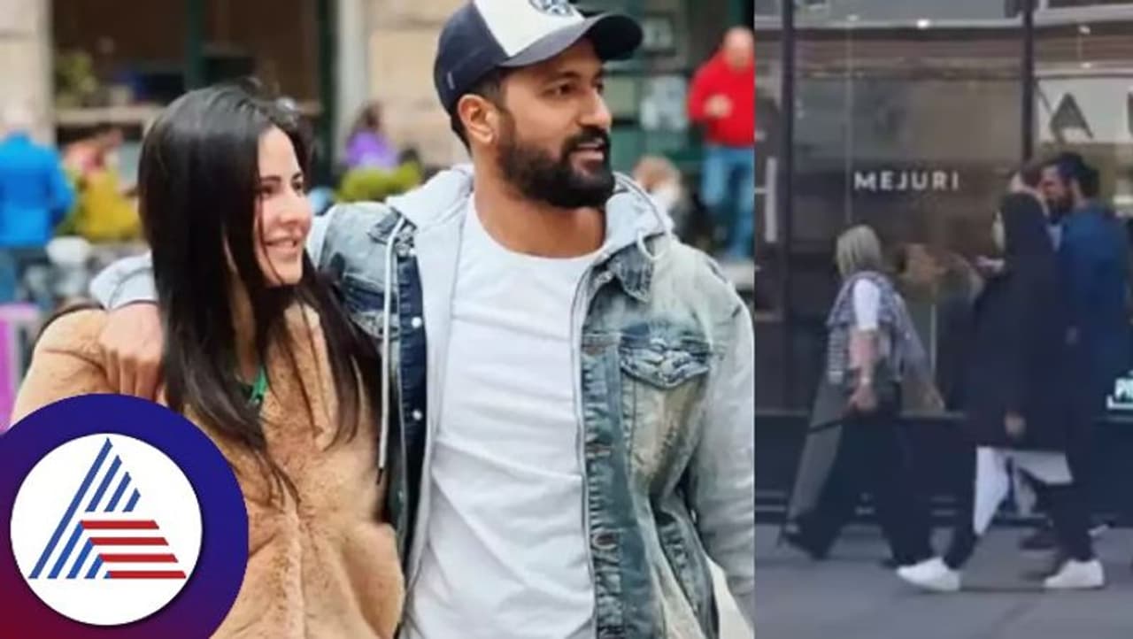 ಪಕ್ಕದಲ್ಲಿ ವಿಕ್ಕಿ ನೀಲಿ ಶರ್ಟ್ ಮತ್ತು ಕಂದು ಬಣ್ಣದ ಬೂಟುಗಳೊಂದಿಗೆ ಕಪ್ಪು ಡೆನಿಮ್ನಲ್ಲಿ ಕತ್ರೀನಾ ಕೈ ಹಿಡಿದು ದಾರಿಹೋಕರು ತಳ್ಳದಂತೆ ರಕ್ಷಿಸುತ್ತಿದ್ದಾರೆ.