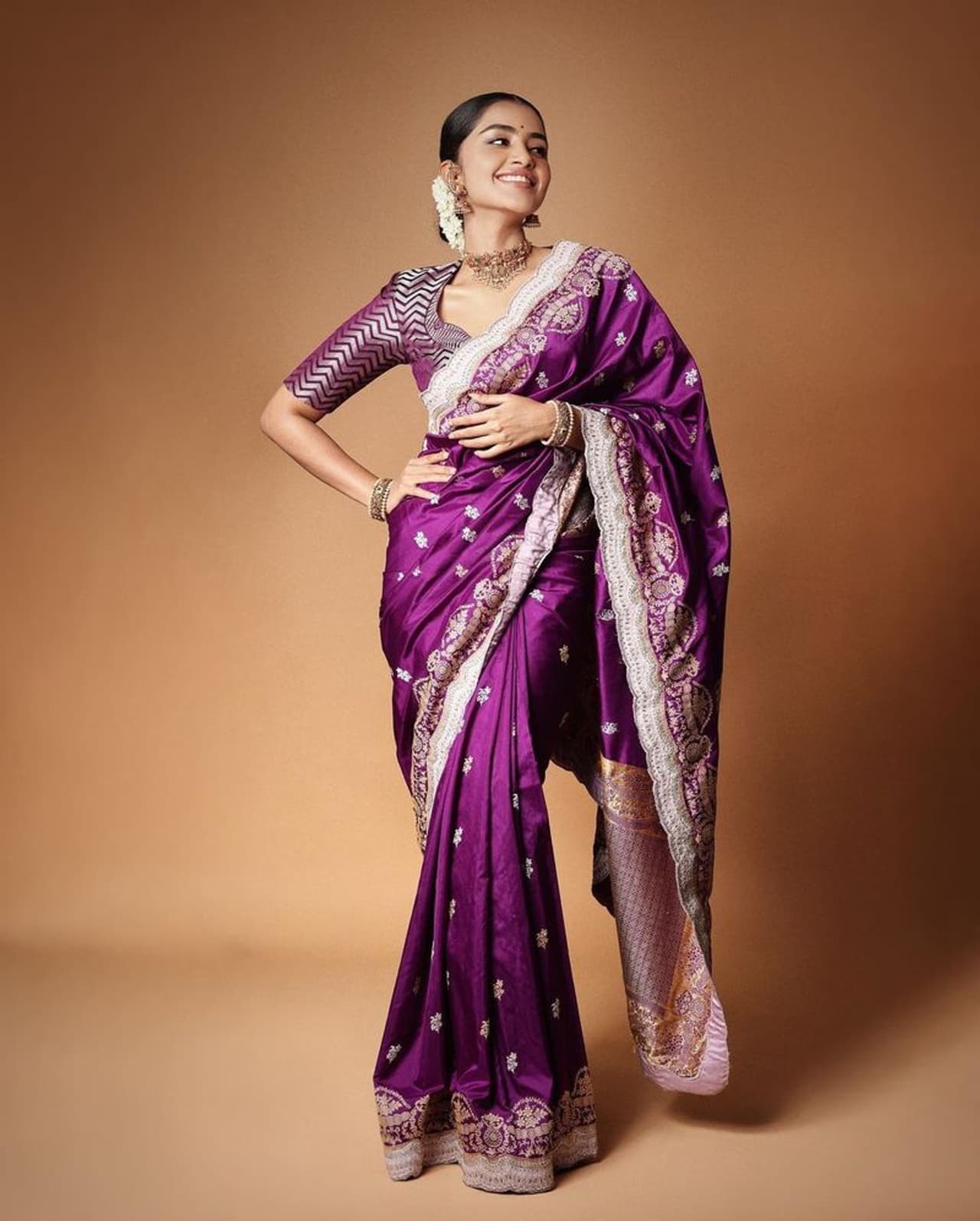 ಅನುಪಮಾ ಪರಮೇಶ್ವರನ್ ಸಾಮಾಜಿಕ ಜಾಲತಾಣಲದಲ್ಲಿ ಹಂಚಿಕೊಂಡ ಫೋಟೋಗಳು ಯಾವುದಕ್ಕೂ ಕಡಿಮೆ ಇಲ್ಲ ಎನ್ನುತ್ತಿದ್ದಾರೆ ನೆಟ್ಟಿಗರು. ನೇರಳೆ ಬಣ್ಣದ ಸೀರೆ ಉಟ್ಟು, ಕೂದಲನ್ನು ತುರುಬು ಕಟ್ಟಿ, ಸುತ್ತಲು ಮಲ್ಲಿಗೆ ಮುಡಿದು, ಆಭರಣಗಳನ್ನು ಧರಿಸಿ ಸಾಂಪ್ರದಾಯಿಕ ಲುಕ್ನಲ್ಲಿ ಕಾಣಿಸಿಕೊಂಡಿದ್ದಾರೆ.
