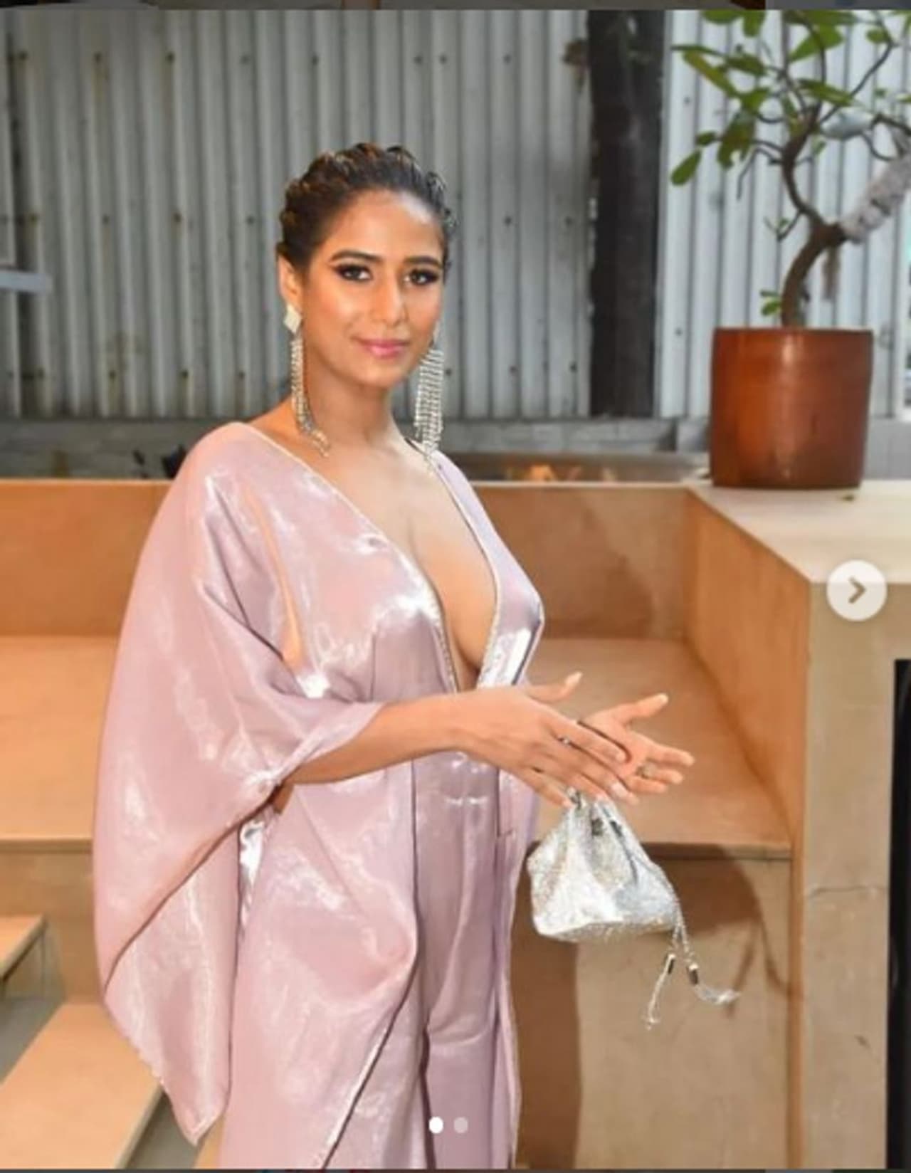 ಹೆಚ್ಚು ಎಕ್ಸೋಪೋಸಿಂಗ್ ನೆಕ್ಲೈನ್ ಹೊಂದಿದ ಡ್ರೆಸ್ ಜೊತೆ ದೊಡ್ಡ ಕಿವಿಯೊಲೆ ಧರಿಸಿದ್ದ ಪೂನಂ ಬಿಳಿ ಹೀಲ್ಡ್ ಚಪ್ಪಲಿ ಮತ್ತು ಹೊಳೆಯುವ ಸಿಲ್ವರ್ ಹ್ಯಾಂಡ್ ಬ್ಯಾಗ್ ಹಿಡಿದು ಲುಕ್ ಪೂರ್ಣಗೊಳಿಸಿದ್ದರು.