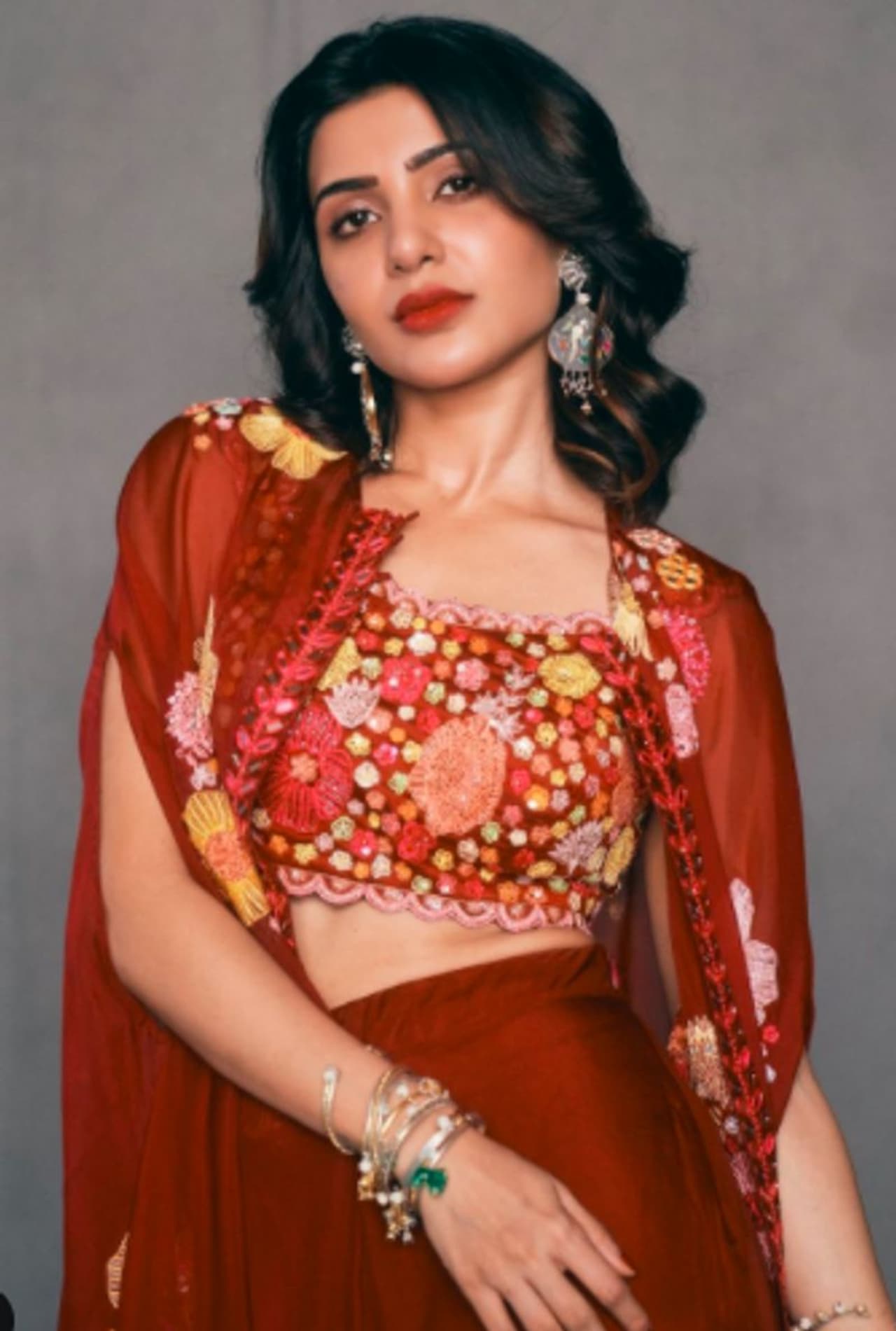 ಫೋಟೋಗಳಲ್ಲಿ ಸಮಂತಾ ರುತ್ ಪ್ರಭು ಅವರು ಕೆಂಪು, ಹೂವಿನ ಕ್ರಾಪ್ ಟಾಪ್ನಲ್ಲಿ ಮಿಂಚಿದ್ದಾರೆ. ನಟಿ ಕೆಂಪು ಶೀರ್, ಹೂವಿನ ಕೇಪ್ನೊಂದಿಗೆ ಇದ್ದ ಉಡುಪಿನೊಂದಿಗೆ ಹಬ್ಬದ ಸಂಭ್ರಮ ಹೆಚ್ಚಿಸಿದ್ದಾರೆ. ಸಿಂಗಲ್ ಆಗಿ ಎರಡು ಫೋಟೋಗಳನ್ನು ಶೇರ್ ಮಾಡಿದ್ದಾರೆ.