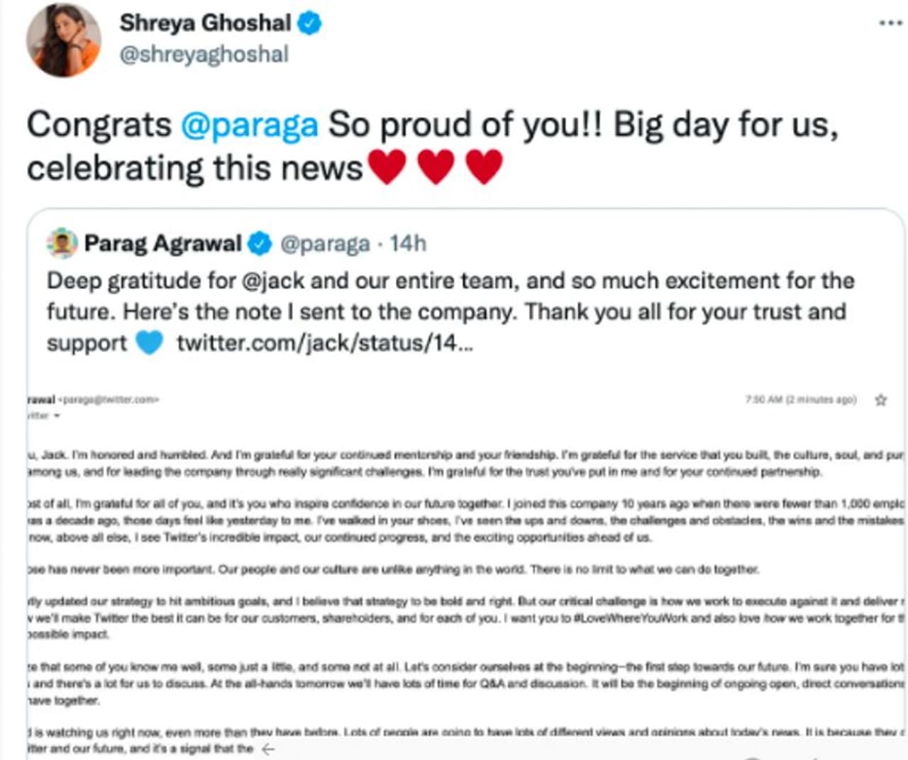 Twitter CEO Parag Agrawal: ಇವರು ಶ್ರೇಯಾ ಘೋಷಲ್ ಬಾಲ್ಯ ಸ್ನೇಹಿತ ಚೈಲ್ಡ್ಹುಟ್ ಫ್ರೆಂಡ್ ಸಾಧನೆಗೆ ಹೆಮ್ಮೆಪಟ್ಟ ಖ್ಯಾತ ಗಾಯಕಿ