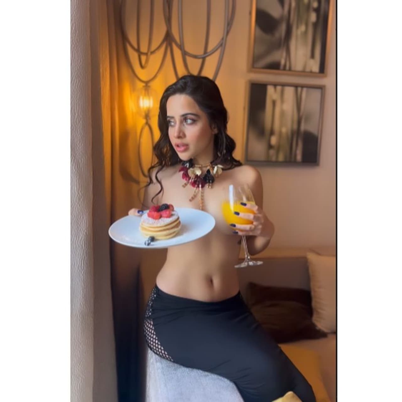 ಇದೀಗ ಮತ್ತೆ ಅರೆಬೆತ್ತಲಾಗಿ ಬಂದಿರುವ ಉರ್ಫಿ ವಿಡಿಯೋ ಸಿಕ್ಕಾಪಟ್ಟೆ ವೈರಲ್ ಆಗಿದೆ. ಟಾಪ್ ಲೆಸ್ ಆಗಿ ಕಾಣಿಸಿಕೊಂಡಿರುವ ಉರ್ಫಿ ಬೆಳಗ್ಗೆಯ ತಿಂಡಿ ತಿನ್ನುತ್ತಿದ್ದಾರೆ. ಟಾಪ್ ಧರಿಸದೇ ಹಾಗೆ ಕುಳಿತಿರುವ ಉರ್ಫಿ ಎದೆಯ ಭಾಗಕ್ಕೆ ಪ್ಲೇಟ್ ಮತ್ತು ಜ್ಯೂಸ್ ಅಡ್ಡ ಹಿಡಿದುಕೊಂಡಿದ್ದಾರೆ.