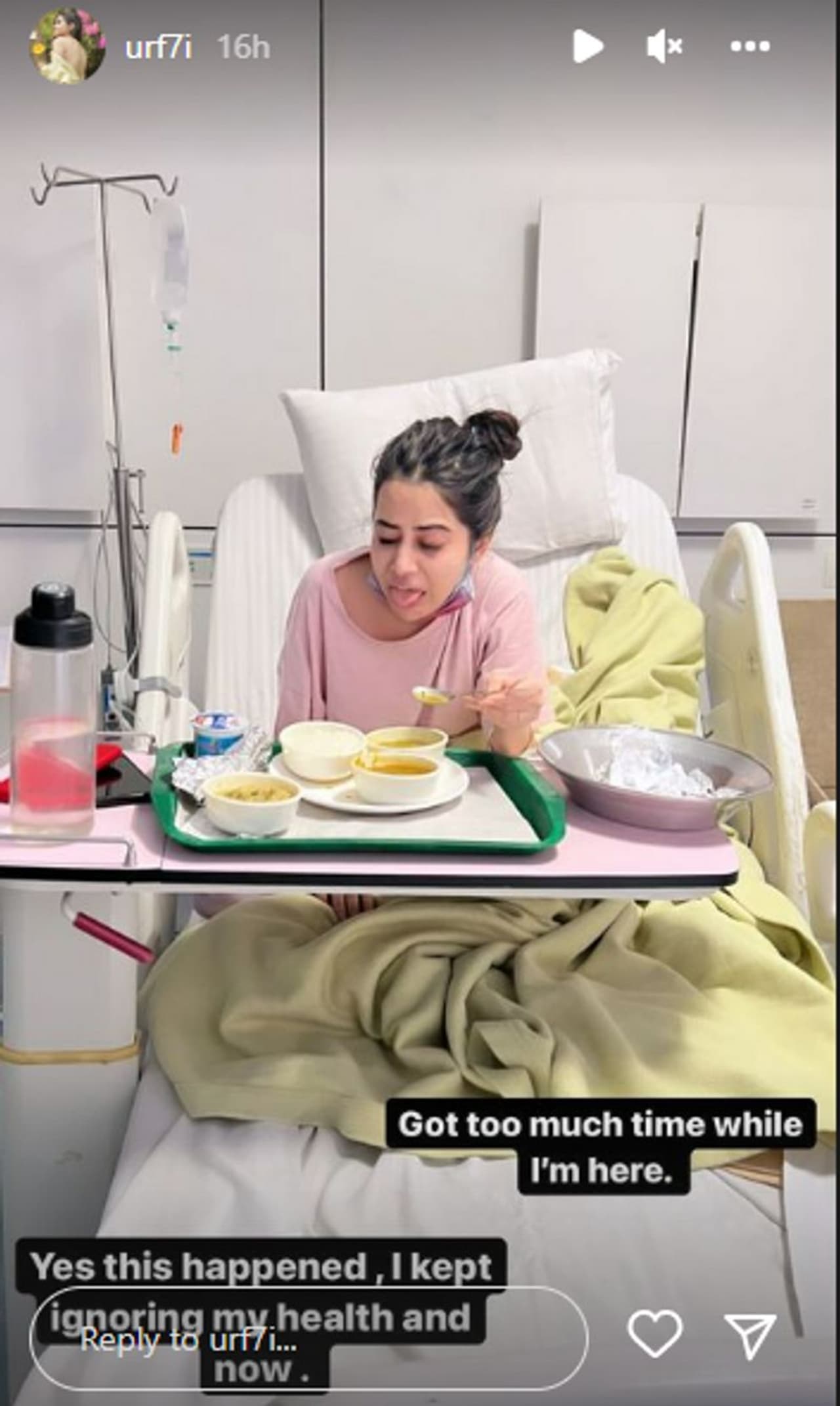 ಸದ್ಯ ಆಸ್ಪತ್ರೆಯಲ್ಲಿ ಚಿಕಿತ್ಸೆ ಪಡೆಯುತ್ತಿರುವ ನಟಿ ಉರ್ಫಿ ಫೋಟೋವನ್ನು ಶೇರ್ ಮಾಡಿದ್ದಾರೆ. ಆಸ್ಪತ್ರೆ ಬೆಡ್ ಮೇಲೆ ಇರುವ ಫೋಟೋ ಹಂಚಿಕೊಂಡು ನಾನು ಇದುವರೆಗೂ ನನ್ನ ಆರೋಗ್ಯ ಕಡೆಗಣಿಸಿದ್ದಕ್ಕೆ ಈಗ ಇಂಥ ಸ್ಥಿತಿ ಎಂದು ಬರೆದುಕೊಂಡಿದ್ದಾರೆ. ಬೆಡ್ ಮೇಲೆ ಕುಳಿತು ಆಹಾರ ತಿನ್ನುತ್ತಿರುವ ಫೋಟೋ ಹಂಚಿಕೊಂಡಿದ್ದಾರೆ.