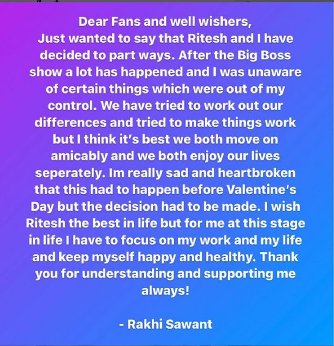ಸಂಗತಿಗಳು ನಡೆದಿವೆ. ನಾವು ಬಹಳಷ್ಟು ಪ್ರಯತ್ನಿಸಿದ್ದೇವೆ. ಆದರೆ ಕೊನೆಯಲ್ಲಿ ನಾವು ನಮ್ಮ ಜೀವನವನ್ನು ಪ್ರತ್ಯೇಕವಾಗಿ ಕಳೆಯಲು ನಿರ್ಧರಿಸಿದ್ದೇವೆ. ನಾವಿಬ್ಬರೂ ಪ್ರತ್ಯೇಕವಾಗಿ ಮುಂದುವರಿಯುವುದು ಉತ್ತಮ ಎಂದು ನಾನು ಭಾವಿಸುತ್ತೇನೆ. ಪ್ರೇಮಿಗಳ ದಿನಕ್ಕೆ ಒಂದು ದಿನ ಮೊದಲು ಇದೆಲ್ಲವೂ ಸಂಭವಿಸಿದೆ ಎಂದು ನನಗೆ ತುಂಬಾ ಬೇಸರವಾಗಿದೆ. ಆದರೆ ನಿರ್ಧಾರ ತೆಗೆದುಕೊಳ್ಳಬೇಕಾಗಿತ್ತು. ರಿತೇಶ್ ಜೀವನದಲ್ಲಿ ಎಲ್ಲವೂ ಒಳ್ಳೆಯದಾಗಲಿ ಎಂದು ಆಶಿಸುತ್ತೇನೆ. ಇದೀಗ ನಾನು ನನ್ನ ಕೆಲಸದ ಮೇಲೆ ಗಮನ ಹರಿಸಬೇಕು. ನನ್ನನ್ನು ಸಂತೋಷದಿಂದ ಮತ್ತು ಆರೋಗ್ಯವಾಗಿಟ್ಟುಕೊಳ್ಳಬೇಕು.ನನ್ನನ್ನು ಅರ್ಥಮಾಡಿಕೊಂಡ ಮತ್ತು ಬೆಂಬಲಿಸಿದ್ದಕ್ಕಾಗಿ ಎಲ್ಲರಿಗೂ ಧನ್ಯವಾದಗಳು,' ಎಂದು ರಾಖಿ ಸಾವಂತ್ ಪೋಸ್ಟ್ ಮಾಡಿದ್ದಾರೆ