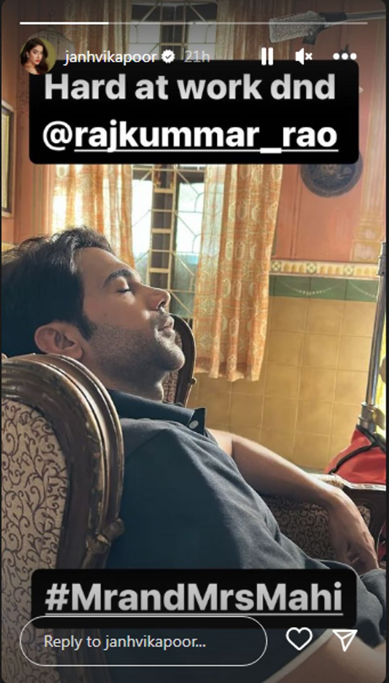 ಜಾನ್ವಿ ಹಂಚಿಕೊಂಡ ಪೋಟೋಗೆ 'Hard at work dnd @rajkumma_rao Mr and Mrs Mahi' ಎಂದು ಶೀರ್ಷಿಕೆ ನೀಡಿದ್ದಾರೆ. ಫೋಟೋದಲ್ಲಿ, ರಾಜ್ಕುಮಾರ್ ರಾವ್ ಸೋಫಾ ಮೇಲೆ ಕುಳಿತು ನಿದ್ರೆ ಮಾಡುತ್ತಿರುವುದನ್ನು ಕಾಣಬಹುದು.
