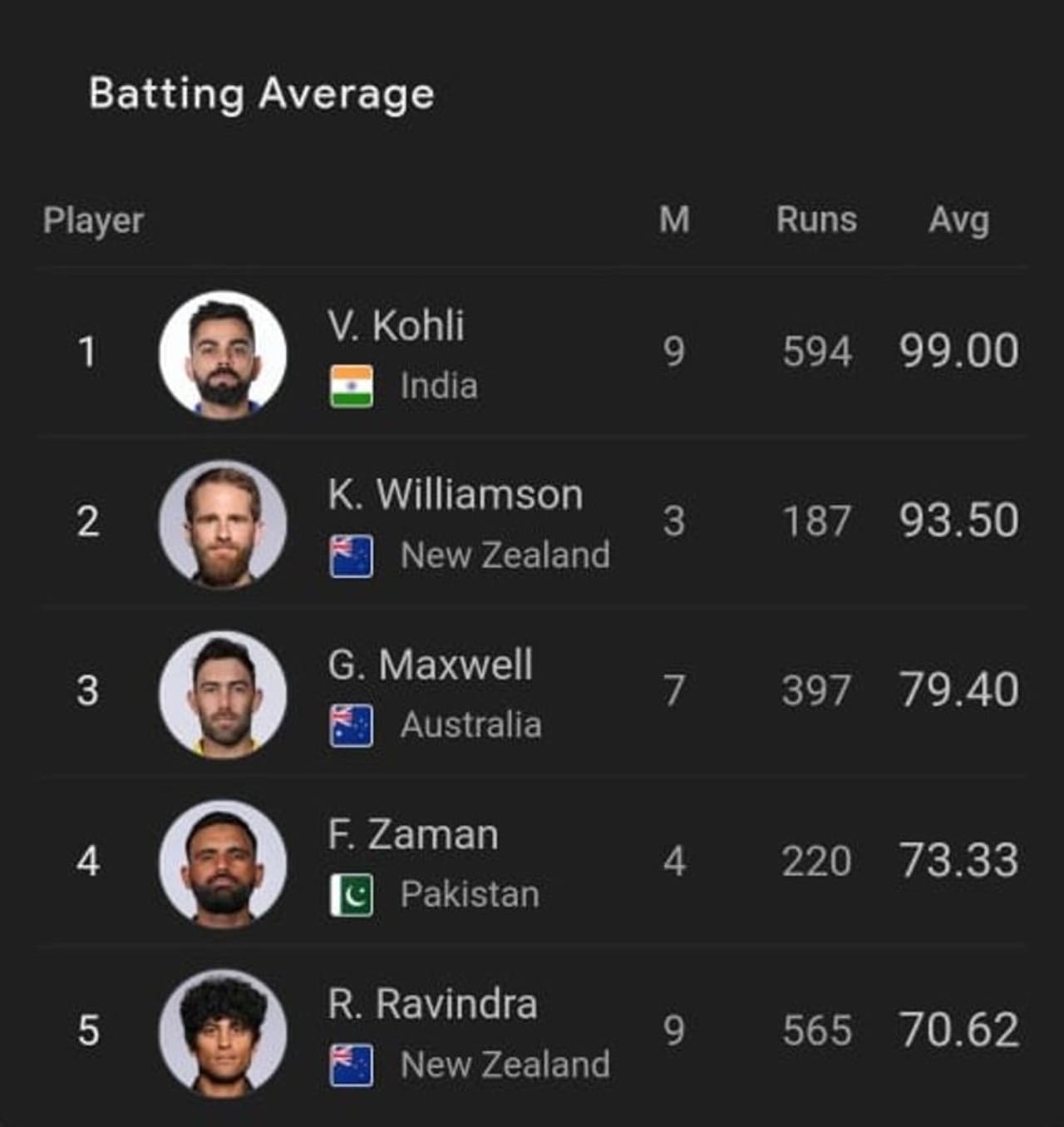 ಮತ್ತೊಂದೆಡೆ ವಿಶ್ವಕಪ್ ಲೀಗ್ನಲ್ಲಿ ಬೆಸ್ಟ್ ಬ್ಯಾಟಿಂಗ್ ಸರಾಸರಿ ಕಾಯ್ದುಕೊಂಡ ಬ್ಯಾಟ್ಸ್ಮನ್ಗಳಲ್ಲಿ ವಿರಾಟ್ ಕೊಹ್ಲಿ ಅಗ್ರ ಸ್ಥಾನದಲ್ಲಿದ್ದಾರೆ. ಇವರ ಬ್ಯಾಟಿಂಗ್ ಸರಾಸರಿ 99 ಇದೆ. ನಂತರ ಸ್ಥಾನದಲ್ಲಿ ಕೇನ್ ವಿಲಿಯಮ್ಸನ್ 93, ಗ್ಲೆನ್ ಮ್ಯಾಕ್ಸ್ 73 ಬ್ಯಾಟಿಂಗ್ ಸರಾಸರಿ ಹೊಂದಿದ್ದಾರೆ.