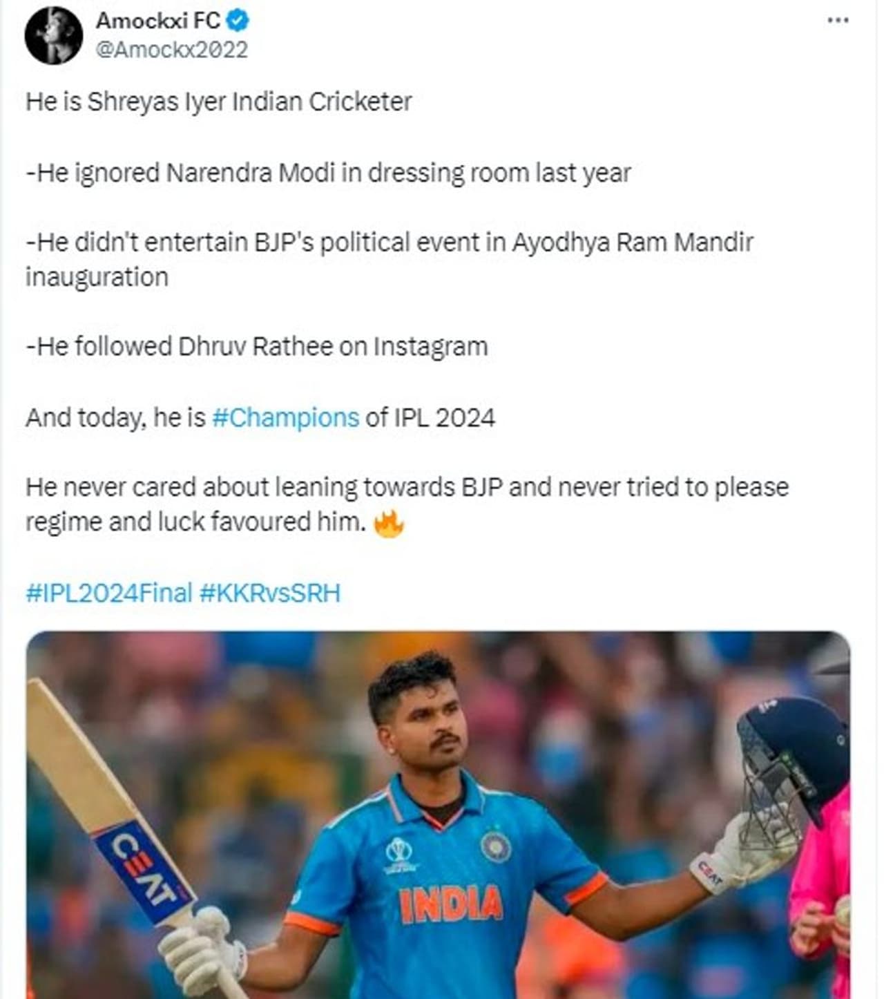 ಇನ್ಸ್ಟಾಗ್ರಾಮ್ನಲ್ಲಿ ಧೈರ್ಯವಾಗಿ ಶ್ರೇಯಸ್ ಅಯ್ಯರ್, ಮೋದಿ ಸರ್ಕಾರದ ಕಟು ವಿಮರ್ಶಕರಾಗಿರುವ ಧ್ರುವ್ ರಾಥಿಯನ್ನು ಫಾಲೋ ಮಾಡಿದರು ಇದೀಗ ಐಪಿಎಲ್ ಟ್ರೋಫಿ ಗೆಲ್ಲುವಲ್ಲಿಯೂ ಶ್ರೇಯಸ್ ಯಶಸ್ವಿಯಾಗಿದ್ದಾರೆಂಬ ಪೋಸ್ಟಿನಲ್ಲಿ ಹೇಳಲಾಗಿದ್ದು, ಇದರ ಪರ, ವಿರೋಧ ಚರ್ಚೆಗಳು ನಡೆಯುತ್ತಿವೆ.