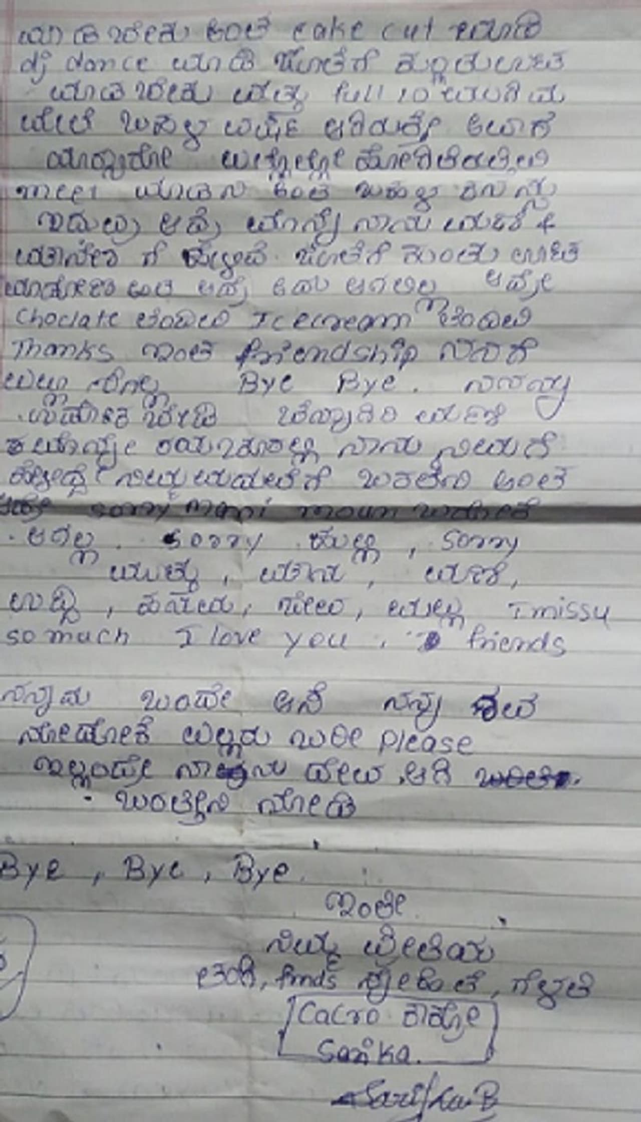 ಹಲವು ಗೆಳೆಯ ಗೆಳತಿಯರ ಹೆಸರನ್ನು ಡೆತ್ನೋಟ್ನಲ್ಲಿ ಬರೆದಿರುವ ವಿದ್ಯಾರ್ಥಿನಿ ನಾನು ನಿಮ್ಮೆಲ್ಲರನ್ನೂ ಮಿಸ್ ಮಾಡಿಕೊಳ್ಳುತ್ತೇನೆ ಎಂದಿದ್ದಾಳೆ. I Love you gus so much ಎಂದೂ ಬರೆದುಕೊಂಡಿದ್ದಾಳೆ.
