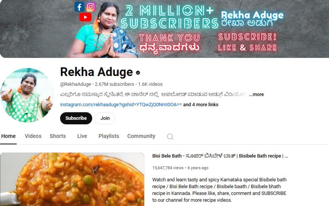 ಯುಟ್ಯೂಬ್ನಲ್ಲಿ 2.67 ಮಿಲಿಯನ್ ಫಾಲೋವರ್ಸ್ಗಳನ್ನು ಹೊಂದಿರುವ ರೇಖಾ ಅಡುಗೆ ಯೂಟ್ಯೂಬ್ ಚಾನೆಲ್ ವಿಶೇಷವಾಗಿ ಆಹಾರದ ರೆಸಿಪಿಗಳನ್ನು ಮಾಡಿ ತೋರಿಸುವ ಯೂಟ್ಯೂಬ್ ಚಾನೆಲ್ ಆಗಿದ್ದು, ವಿಶೇಷವಾಗಿ ಹೊಸದಾಗಿ ಆಹಾರದ ತಯಾರಿಸುವ ಉತ್ಸಾಹಿಗಳಿಗೆ ಒಳ್ಳೆ ಮಾರ್ಗದರ್ಶನ ನೀಡುತ್ತದೆ.