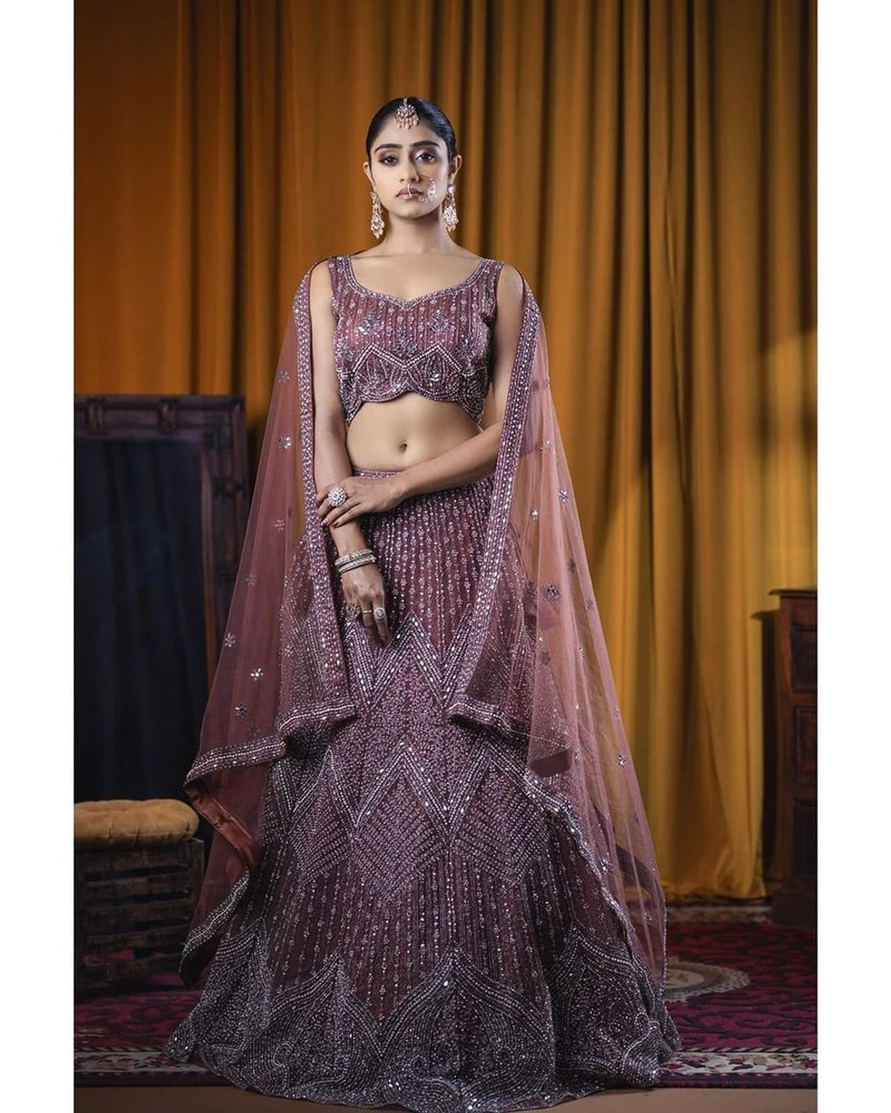 ಪರ್ಪಲ್ ಬಣ್ಣದ ಹೆವಿ ವರ್ಕ್ ಇರೋ ಸ್ಕರ್ಟ್, ಬ್ಲೌಸ್, ಲೆಹಂಗಾ ತೊಟ್ಟು ಸಂಗೀತಾ ಫೋಟೋಗಳಿಗೆ ಫೋಸ್ ನೀಡಿದ್ದಾರೆ. ಇದಕ್ಕೆ ದೊಡ್ಡ ಹರಳಿನ ಕಿವಿಯೋಲೆ, ಮಾಂಗ್ ಟಿಕಾ, ಮೂಗುತ್ತಿಯನ್ನು ಪೇರ್ ಮಾಡಿದ್ದು ಅದ್ಭುತವಾಗಿ ಕಾಣುತ್ತಿದ್ದಾರೆ.