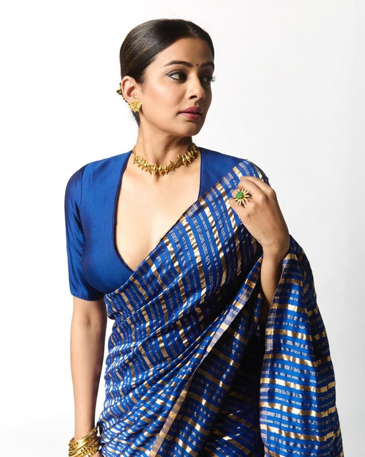 ಪ್ರಿಯಾಮಣಿ, ಇನ್ಸ್ಟಾಗ್ರಾಂನಲ್ಲಿ ಯಾವಾಗ್ಲೂ ಸ್ಟೈಲಿಶ್ ಫೋಟೋಗಳನ್ನು ಶೇರ್ ಮಾಡ್ತಿರ್ತಾರೆ. ಮಾಡರ್ನ್, ಟ್ರೆಡಿಶನಲ್ ಲುಕ್ನಲ್ಲಿ ಮಿಂಚುತ್ತಾರೆ. ಇತ್ತೀಚಿಗೆ ನೀಲಿ ಕಲರ್ ಸೀರೆಯುಟ್ಟು ಮುದ್ದಾಗಿ ಫೋಸ್ ನೀಡಿದ್ದಾರೆ. ಇದಕ್ಕೆ ಗೋಲ್ಡನ್ ಕಲರ್ ಚೋಕರ್ ಸೆಟ್ ಹಾಕ್ಕೊಂಡಿದ್ದಾರೆ.