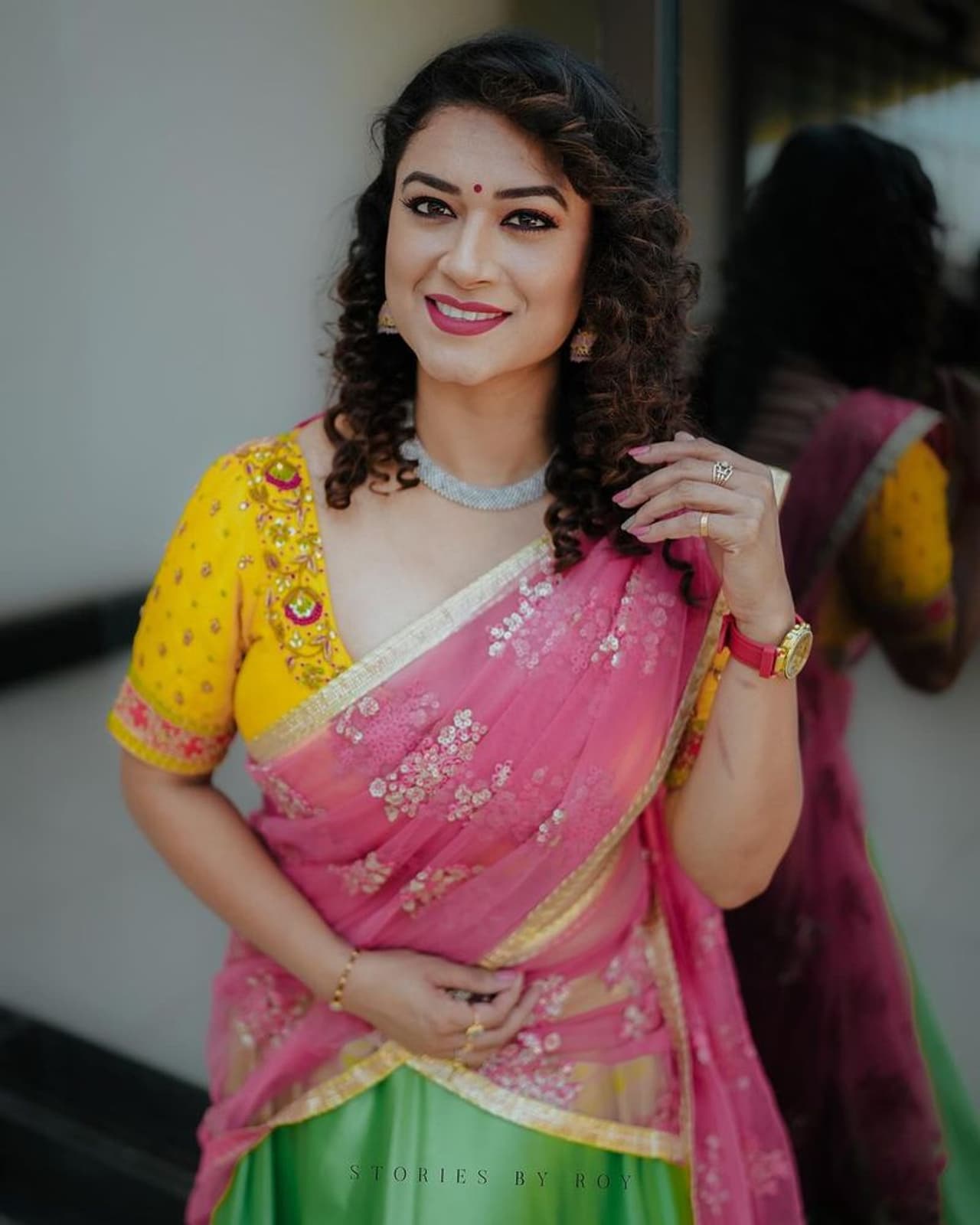 ಇತ್ತೀಚಿಗೆ ಯೆಲ್ಲೋ ಬ್ಲೌಸ್, ಗ್ರೀನ್ ಸ್ಕರ್ಟ್ ಹಾಗೂ ಪಿಂಕ್ ದುಪ್ಪಟ್ಟಾದಲ್ಲಿ ಮಿಂಚಿದ್ದಾರೆ. ಇದಕ್ಕೆ ಮ್ಯಾಚಿಂಗ್ ಬಳೆಯನ್ನು ಸಹ ಹಾಕಿಕೊಂಡಿದ್ದಾರೆ. ಕರ್ಲಿ ಹೇರ್ ಡಿಫರೆಂಟ್ ಲುಕ್ಗೆ ನೆಟ್ಟಿಗರು ವಾವ್ ಅಂದಿದ್ದಾರೆ.