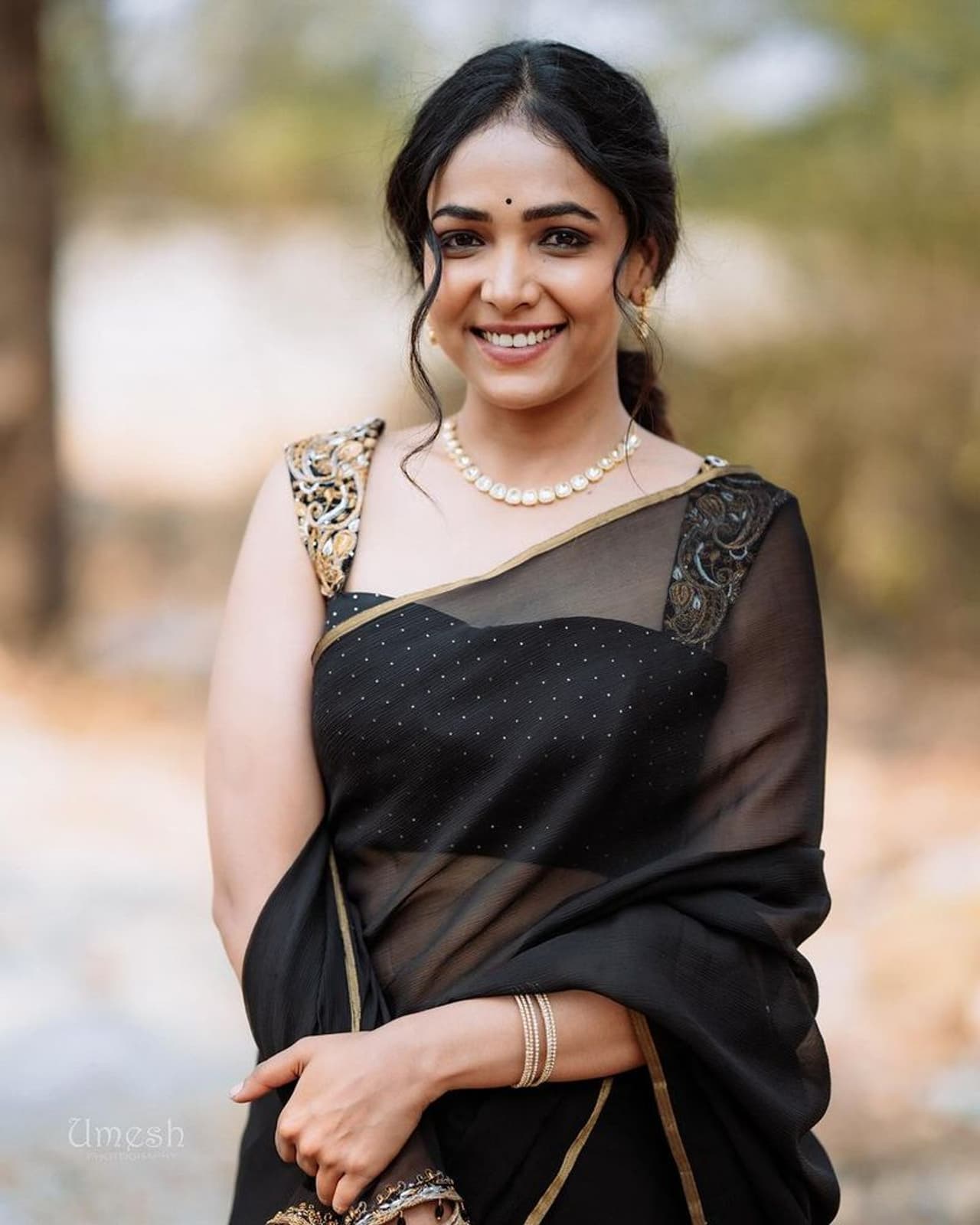ಅನುಪಮಾ ಗೌಡ, ಬ್ಲ್ಯಾಕ್ ಸೀರೆಯುಟ್ಟು ಸ್ಲೀವ್ಲೆಸ್ ಬ್ಲೌಸ್ ಹಾಕಿದ್ದಾರೆ. ಇದಕ್ಕೆ ಸುಂದರವಾದ ನೆಕ್ಲೇಸ್ ಸೆಟ್ ಹಾಕ್ಕೊಂಡು ಕಪ್ಪು ಬಿಂದಿಯನ್ನು ಹಣೆಗೆ ಇಟ್ಟುಕೊಂಡಿದ್ದಾರೆ. ಮುಖದ ಮೇಲೆ ಹಾರುವ ಮುಂಗುರುಳಿನ ಜೊತೆ ಅನುಪಮಾ ತುಂಬಾ ಅದ್ಭುತವಾಗಿ ಕಾಣಿಸುತ್ತಿದ್ದಾರೆ.