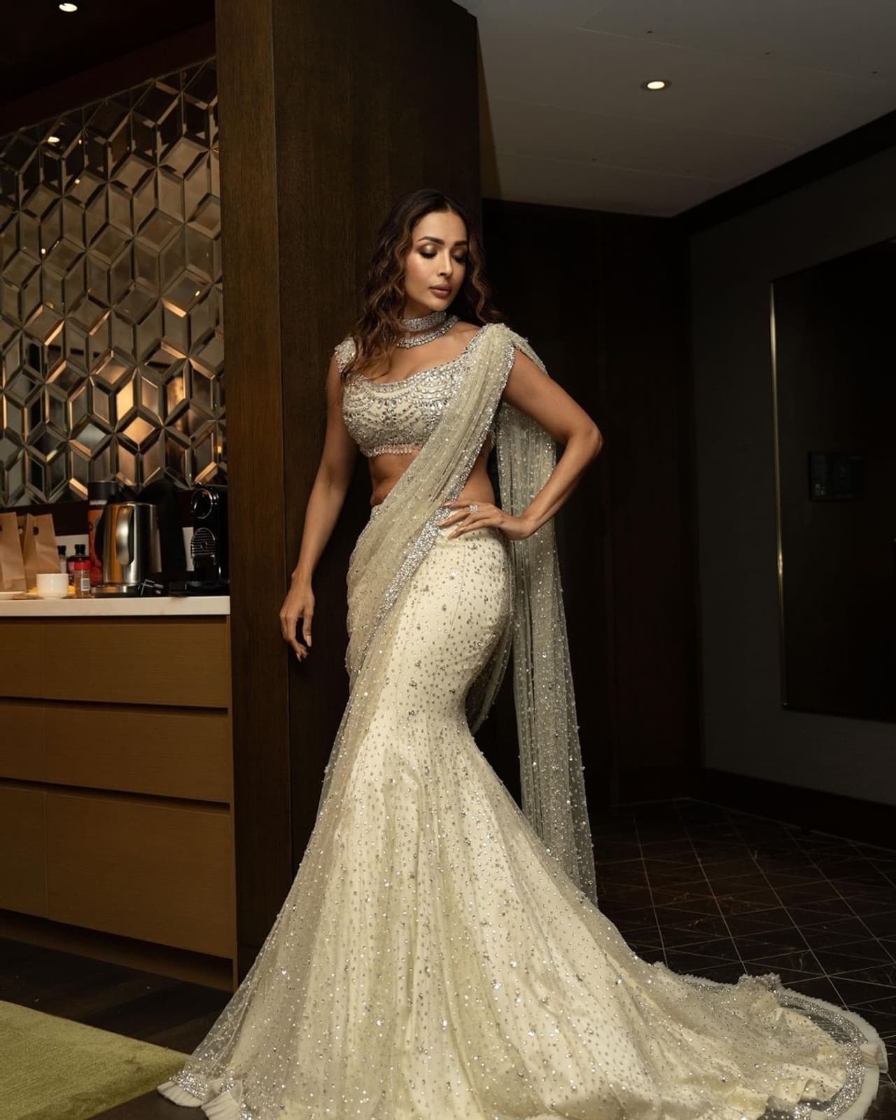 ಈ ಹೊಳೆಯುವ ಸೀರೆಯು ನಟಿಗೆ ಮತ್ಯಕನ್ಯೆಯ ಲುಕ್ ನೀಡಿದೆ. ಈ ಮಿನುಗುವ ಸ್ವರೋವ್ಸ್ಕಿ ಸೀರೆಯೂ ಹೊಳೆಯುವ ಹರಳುಗಳಿಂದ ಅಲಂಕರಿಸಲ್ಪಟ್ಟಿದೆ. ಸಂಪ್ರದಾಯಿಕ ಶೈಲಿಯಲ್ಲಿ ಸೀರೆ ಉಟ್ಟ ಮಲೈಕಾ ಇದಕ್ಕೆ ಸ್ಲೀವ್ಲೆಸ್ ಬ್ಲೌಸ್ ಧಿರಿಸಿ ಎಲ್ಲರ ಟೆಂಪ್ರೇಚರ್ ಹೆಚ್ಚಿಸಿದರು.