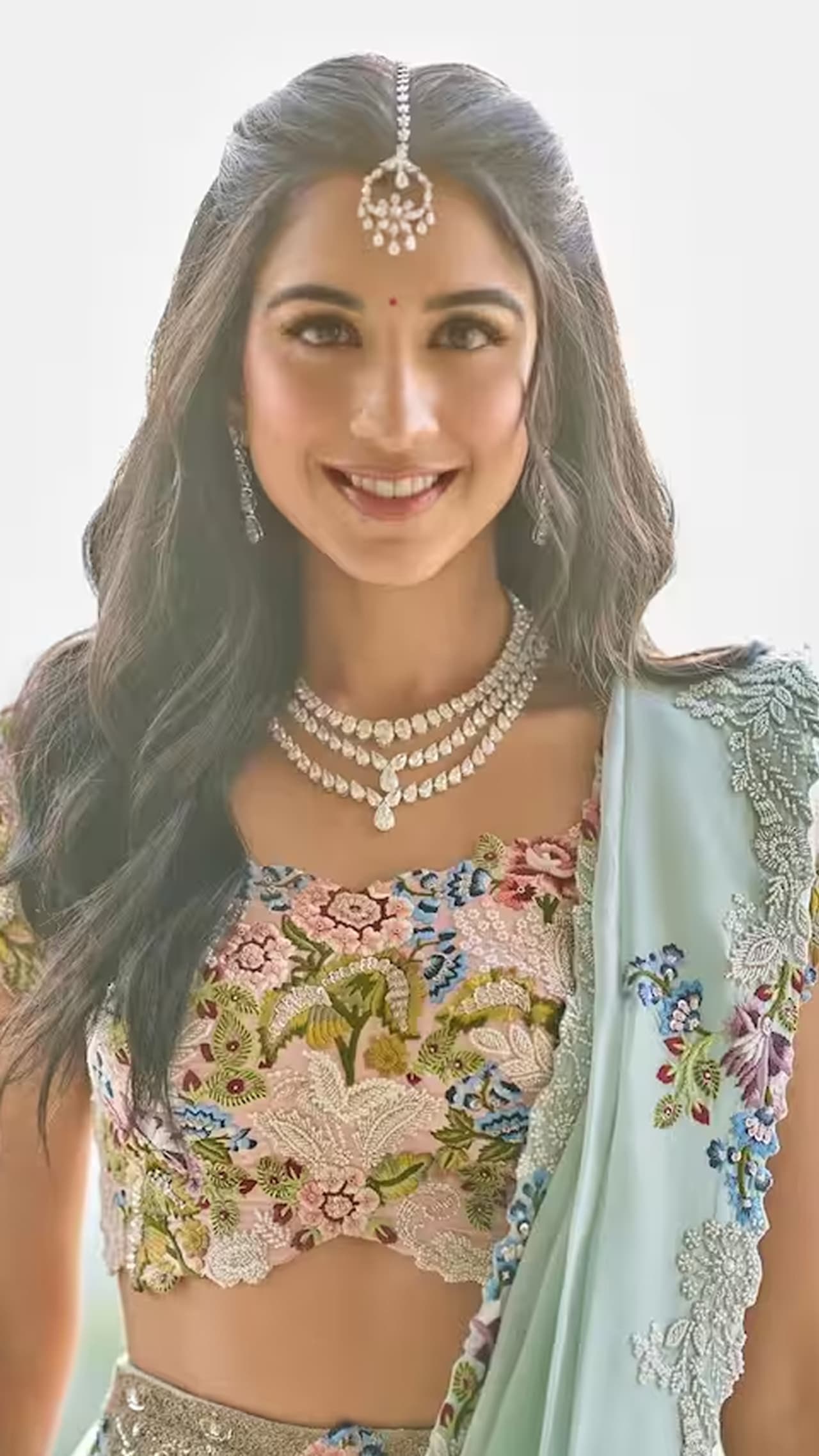 ರಾಧಿಕಾ ಮರ್ಚೆಂಟ್, ಅಬು ಜಾನಿ ಮತ್ತು ಸಂದೀಪ್ ಖೋಸ್ಲಾ ಅವರ ಕಲೆಕ್ಷನ್ ಲಾಂಚ್ ಪಾರ್ಟಿಯಲ್ಲಿ, ಗೋಲ್ಡನ್ ಬಾರ್ಡರ್ನೊಂದಿಗೆ ಜೋಡಿಯಾಗಿರುವ ರಫಲ್ ಡಿಸೈನ್ ಇರೋ ಗುಲಾಬಿ ಬಣ್ಣದ ಸೀರೆಯನ್ನು ಧರಿಸಿದ್ದರು.