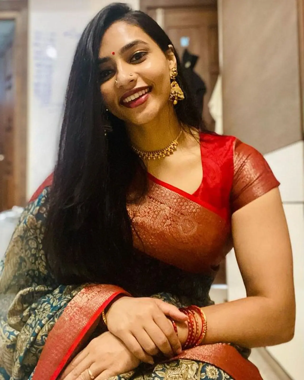 ಹಬ್ಬಕ್ಕೆ ಹೇಳಿ ಮಾಡಿಸಿದ ಕಲರ್ ರೆಡ್. ಬ್ರೈಡೆಲ್ ರೆಡ್ ಕಲರ್ ಎಲ್ಲರಿಗೂ ಚೆನ್ನಾಗಿ ಒಪ್ಪುತ್ತದೆ. ಸಪ್ತಮಿ ಗೌಡ ಕೆಂಪು ಬಣ್ಣದ ಸೀರೆಗೆ ನೀಲಿ ಬಣ್ಣದ ಬ್ಲೌಸ್ ಪೇರ್ ಮಾಡಿದ್ದು, ಆಕರ್ಷಕವಾಗಿ ಕಾಣುತ್ತಿದ್ದರು.