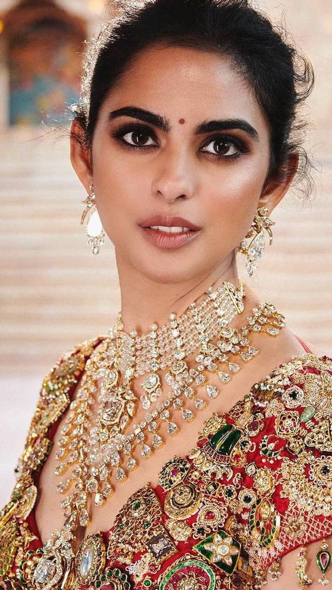 ಇಶಾ ಅಂಬಾನಿ ತಮ್ಮ ಗ್ರ್ಯಾಂಡ್ ಲೆಹೆಂಗಾದೊಂದಿಗೆ ಬಹು-ಪದರದ ವಜ್ರದ ನೆಕ್ಲೇಸ್ನ್ನು ಆಯ್ಕೆ ಮಾಡಿಕೊಂಡರು. ಹೊಂದಾಣಿಕೆಯ ಕಿವಿಯೋಲೆಗಳು, ಕಡಾ ಮತ್ತು ಬ್ರೇಸ್ಲೆಟ್ ಅವಳ ರಾಯಲ್ ನೋಟವನ್ನು ಅದ್ಭುತವಾಗಿ ಕಾಣುವಂತೆ ಮಾಡಿತು.