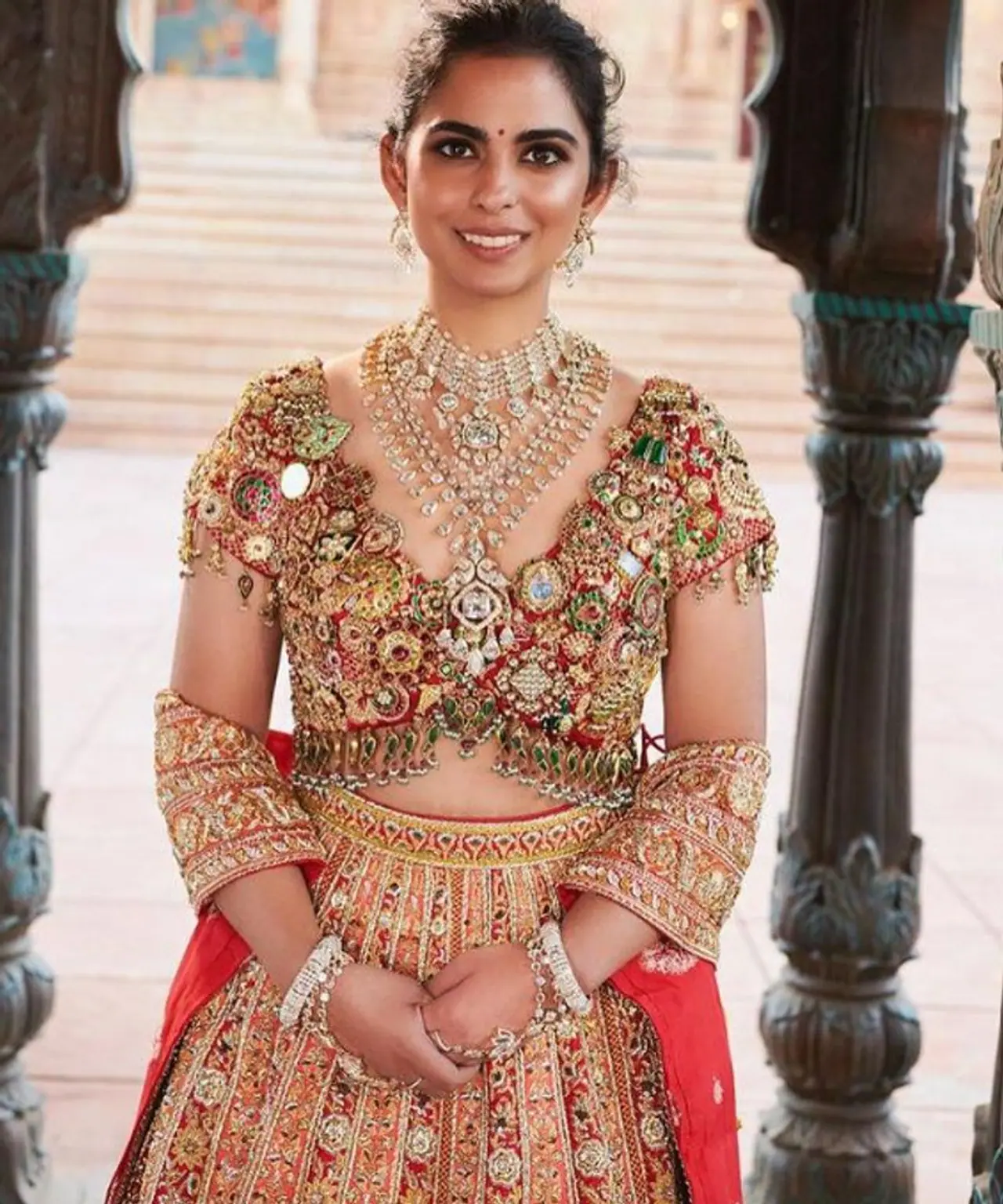 ಆಕೆಯದೇ ಚಿನ್ನ, ವಜ್ರ, ರತ್ನದ ಆಭರಣಗಳನ್ನು ಸೇರಿಸಿ ಹೊಲಿದ ಬ್ಲೌಸ್ ಧರಿಸಿದ ಇಶಾ ಅಂಬಾನಿ