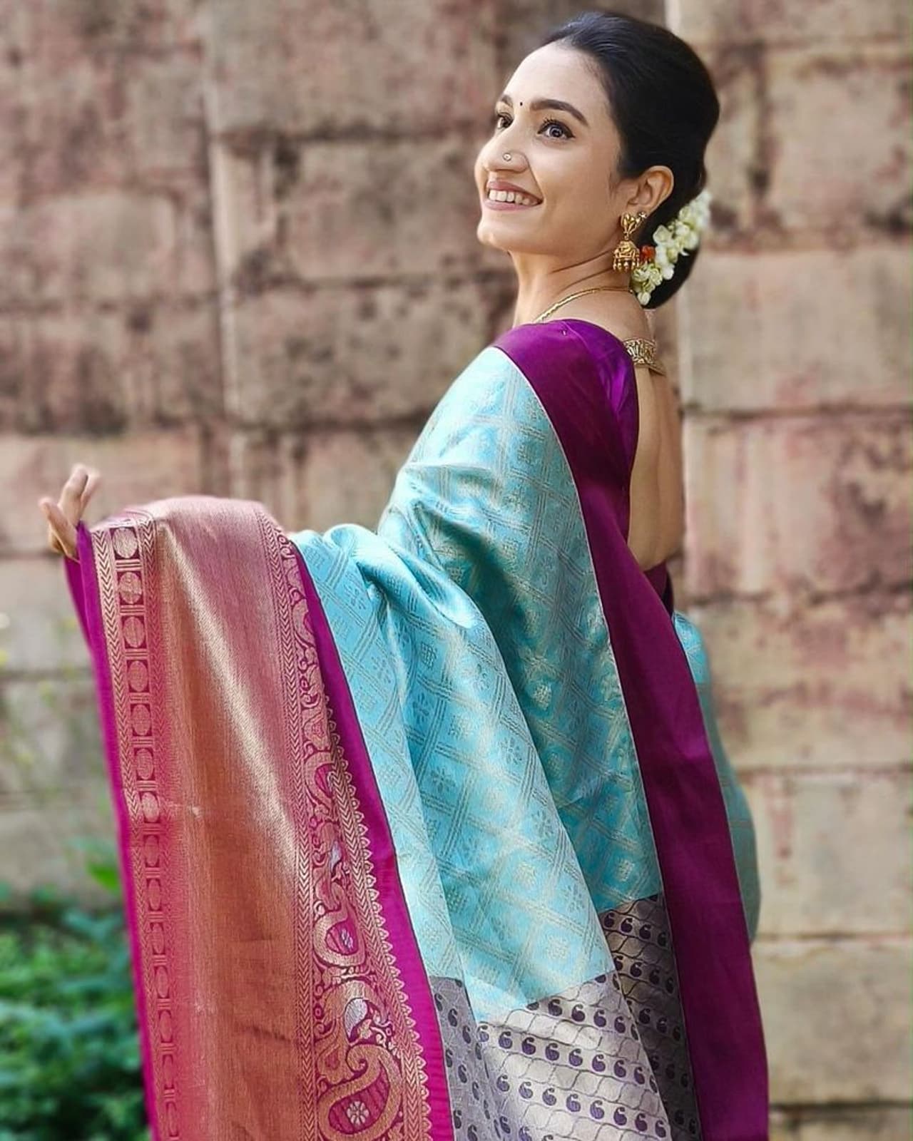 ನೇರಳೆ ಝರಿಯಂಚಿನ ಆಕಾಶನೀಲಿ ಬಣ್ಣದ ಸೀರೆ ಉಟ್ಟ ವೈಷ್ಣವಿ ಗೌಡ ಫೋಟೋಗೆ ಫೋಸ್ ನೀಡಿದ್ದಾರೆ. ಕಾಸಿನ ಸರ, ಜುಮ್ಕಾ, ಮುಡಿಗೆ ಮಲ್ಲಿಗೆ ಮುಡಿದು ಕ್ಯೂಟ್ ಆಗಿ ಸ್ಮೈಲ್ ಕೊಟ್ಟಿದ್ದಾರೆ.