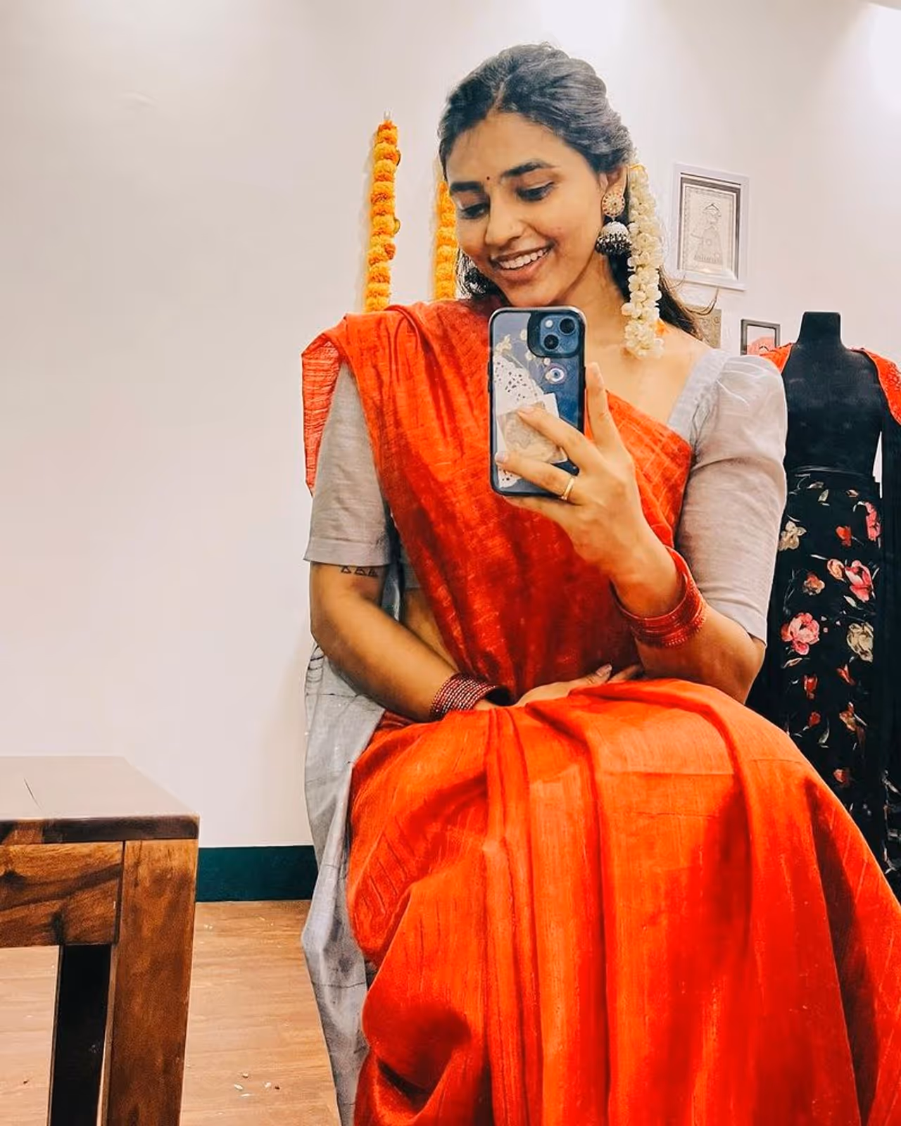 ಆರೆಂಜ್ ಸೀರೆ ಹಾಗೂ ಗ್ರೇ ಕಲರ್ ಬ್ಲೌಸ್ ಧರಿಸಿರೋ ನಟಿ ಸುಂದರವಾಗಿ ಕಾಣುತ್ತಿದ್ದಾರೆ. ದೊಡ್ಡ ಜುಮುಕಿ ಹಾಕ್ಕೊಂಡು, ಕೆಂಪು ಬಳೆಗಳನ್ನು ಧರಿಸಿ, ಮಲ್ಲಿಗೆ ಮುಡಿದು ಫೋಟೋಸ್ಗೆ ಫೋಸ್ ನೀಡಿದ್ದಾರೆ. ಇದಕ್ಕೆ ದಸರಾ ಹಬ್ಬದ ಶುಭಾಶಯಗಳು ಎಂದು ಶೀರ್ಷಿಕೆ ನೀಡಿದ್ದಾರೆ.
