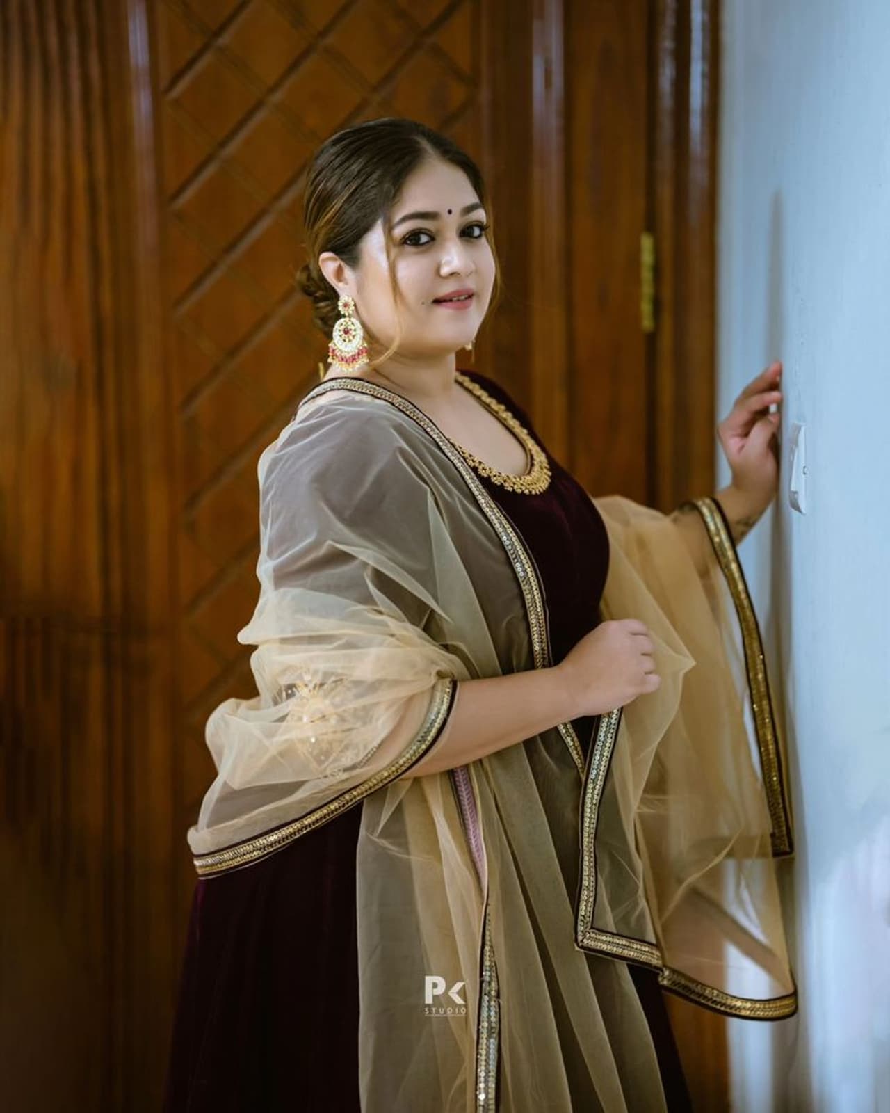 ಮೆರೂನ್-ಗೋಲ್ಡನ್ ಕಲರ್ ಸಲ್ವಾರ್ನಲ್ಲಿ ಮಿಂಚಿದ ಮೇಘನಾ ರಾಜ್, ಅತ್ತಿಗೆಮ್ಮ ಎಂದು ಹೊಗಳಿದ ಫ್ಯಾನ್ಸ್