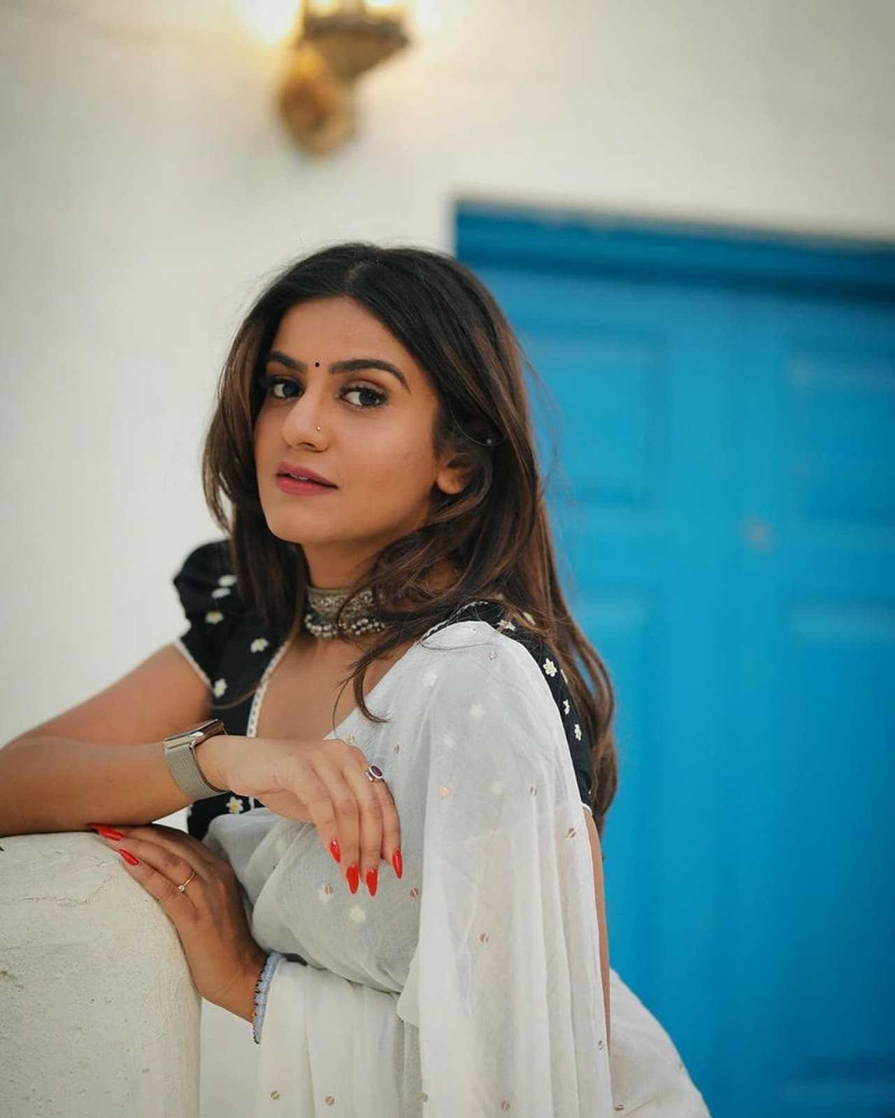 ಬ್ಲ್ಯಾಕ್ನಲ್ಲಿ ವೈಟ್ ಪೋಲ್ಕಾ ಡಾಟ್ ಇರುವ ಬ್ಲೌಸ್ ಹಾಗೂ ಕಂಪ್ಲೀಟ್ ವೈಟ್ ಕಲರ್ ಸೀರೆಯುಟ್ಟು ಫೋಟೋಗಳಿಗೆ ಫೋಸ್ ಕೊಟ್ಟಿದ್ದಾರೆ. ಇದಕ್ಕೆ ಒಪ್ಪುವಂತೆ ಆಕ್ಸಿಡೈಸ್ಡ್ ಚೋಕರ್ ಸೆಟ್ ಸಹ ಧರಿಸಿದ್ದಾರೆ.