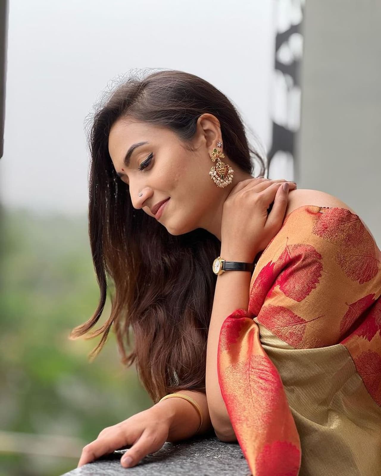 ಗೋಲ್ಡ್ ಕಲರ್ ಸೀರೆಗೆ ರೆಡ್ ಬಾರ್ಡರ್ ಇರುವ ಸೀರೆಯುಟ್ಟು ವೈಷ್ಣವಿ ಗೌಡ ಫೋಟೋಗೆ ಪೋಸ್ ನೀಡಿದ್ದಾರೆ. ಹೇರ್ ಫ್ರೀ ಬಿಟ್ಟಿದ್ದು ದೊಡ್ಡದಾದ ಜುಮ್ಕಾ ಹಾಕ್ಕೊಂಡಿದ್ದಾರೆ. ಕ್ಯೂಟ್ ಆಗಿ ಸ್ಮೈಲ್ ಕೊಟ್ಟಿರೋ ಸೀರಿಯಲ್ ಸೀತಾ ಟ್ರೆಡಿಶನಲ್ ಲುಕ್ ಫ್ಯಾನ್ಸ್ಗೆ ಸಖತ್ ಇಷ್ಟವಾಗಿದೆ.