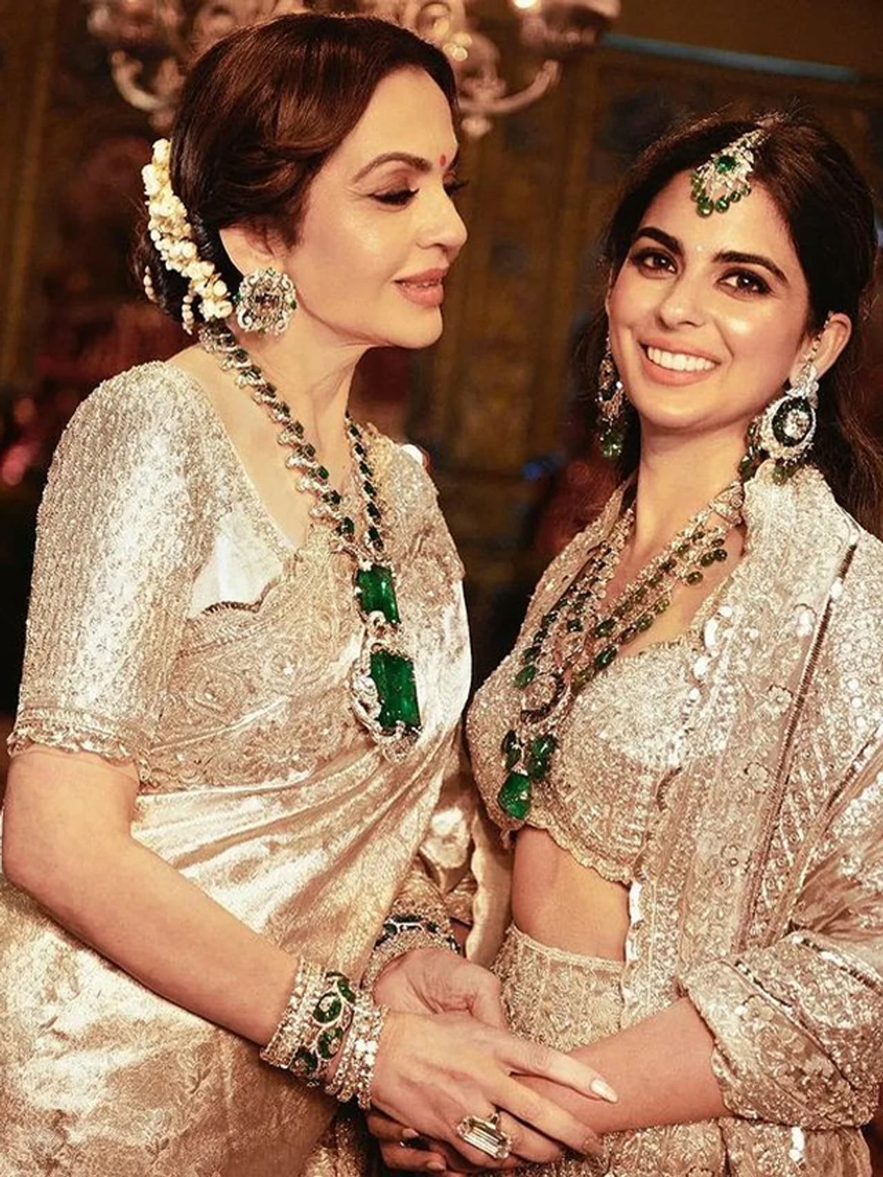 ನೀತಾ ಸಮಾರಂಭಕ್ಕೆ ಕಾಂಚೀಪುರಂ ಸೀರೆಯೊಂದಿಗೆ ಕೋಟಿಗಟ್ಟಲೆ ಬೆಲೆಬಾಳುವ ಪಚ್ಚೆ ಹೊದಿಸಿದ ವಜ್ರದ ನೆಕ್ಲೇಸ್ ಧರಿಸಿದ್ದರು. ಎರಡು ದೊಡ್ಡ ಗಾತ್ರದ ಪೆಂಡೆಂಟ್ಗಳಿಗೆ ಜೋಡಿಸಲಾದ ಪಚ್ಚೆಗಳನ್ನು ಒಳಗೊಂಡಿರುವ ಉದ್ದನೆಯ ನೆಕ್ಲೇಸ್ ಇದಾಗಿದೆ. ಜೊತೆಗೆ ಹೊಂದಾಣಿಕೆಯ ಸ್ಟಡ್ ಕಿವಿಯೋಲೆಗಳು, ಬಳೆಗಳು ಮತ್ತು ಉಂಗುರವನ್ನು ಧರಿಸಿದ್ದರು