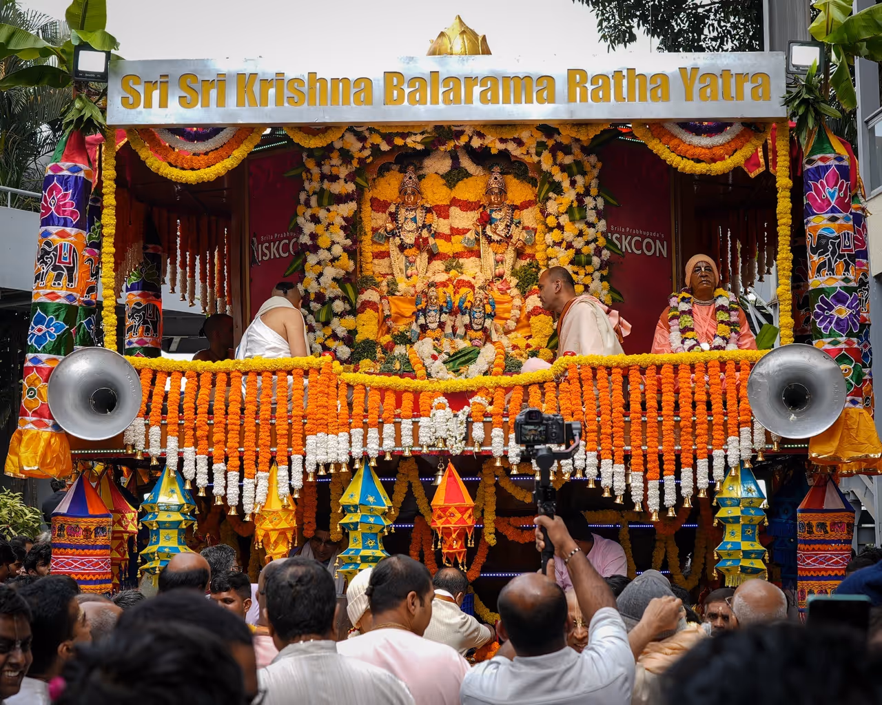 ಸುಮಾರು 26 ಅಡಿ ಎತ್ತರದ, ಆಧುನಿಕ ಸುರಕ್ಷಾ ವ್ಯವಸ್ಥೆ ಹೊಂದಿದ ಭವ್ಯ ರಥವು ರಾಜಾಜಿನಗರದ ಪ್ರಮುಖ ಬೀದಿಗಳಲ್ಲಿ ಸಾಗಿತು. ಹರೇ ಕೃಷ್ಣ ಕೀರ್ತನೆಗಳು ಮತ್ತು ಭಕ್ತಿಗೀತೆಗಳ ಗಾಯನ ಇಡೀ ಪರಿಸರದಲ್ಲಿ ದೈವಿಕ ಕಳೆಯನ್ನು ಹೆಚ್ಚಿಸಿತ್ತು. ರಥ ಸಾಗುವ ಹಾದಿಯುದ್ದಕ್ಕೂ ಭಕ್ತರು ಸಾಲುಗಟ್ಟಿ ನಿಂತು ಭಗವಂತನ ದರ್ಶನ ಪಡೆದು ಪುನೀತರಾದರು.