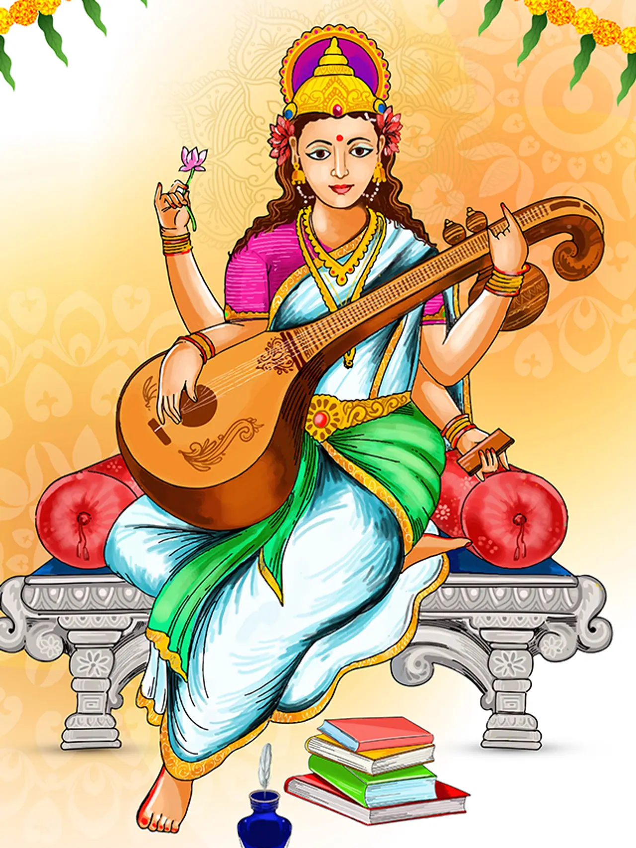 ನಾವು ಹೆಚ್ಚಾಗಿ ಮಾತಾ ಸರಸ್ವತಿಯ ಪ್ರತಿಮೆ ಮತ್ತು ಛಾಯಾಚಿತ್ರಗಳಲ್ಲಿ ಬಿಳಿ ಬಟ್ಟೆಗಳನ್ನು (white saree) ಧರಿಸಿಯೇ ನೋಡಿರುತ್ತೇವೆ. ಜೊತೆಗೆ ತಾಯಿ ಕಮಲ ಮತ್ತು ಹಂಸದ ಮೇಲೆ ಕುಳಿತಿರುತ್ತಾಳೆ. ಜೊತೆಗೆ ನಾಲ್ಕು ಕೈಗಳನ್ನು ಹೊಂದಿದ ಸರಸ್ವತಿಯ ಎರಡು ಕೈಗಳಲ್ಲಿ ವೀಣೆ ಇರುತ್ತದೆ. ತಾಯಿಯ ವೀಣೆಯ ಈ ಶಬ್ಧವು ಪ್ರಕೃತಿಯಲ್ಲಿ, ಸೃಷ್ಟಿಯಲ್ಲಿರುವ ಎಲ್ಲಾ ಜೀವಿಗಳ ಮೇಲೆ ಪ್ರತಿಧ್ವನಿಸುತ್ತದೆ. ತಾಯಿಯ ಸಂಪೂರ್ಣ ರೂಪದ ಮಹತ್ವವನ್ನು ತಿಳಿಯೋಣ.