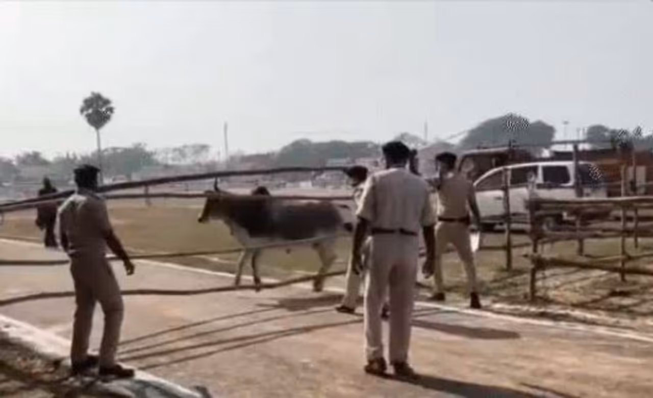 ಸಿಎಂ ಆಗಮನಕ್ಕೆ ಕೆಲ ನಿಮಿಷ ಮೊದಲು ಹೆಲಿಪ್ಯಾಡ್ಗೆ ನುಗ್ಗಿ ಭದ್ರತೆಗಿದ್ದ ಪೊಲೀಸರನ್ನೇ ಓಡಿಸಿದ ಹೋರಿ