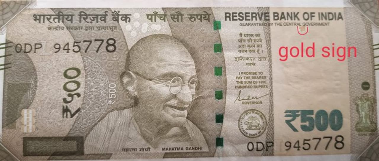 * 500 ರೂ. ನೋಟಿನ ಎಡ ಭಾಗದಲ್ಲಿ ನೋಟು ಮುದ್ರಿಸಿದ ವರ್ಷ ಇರುತ್ತದೆ.