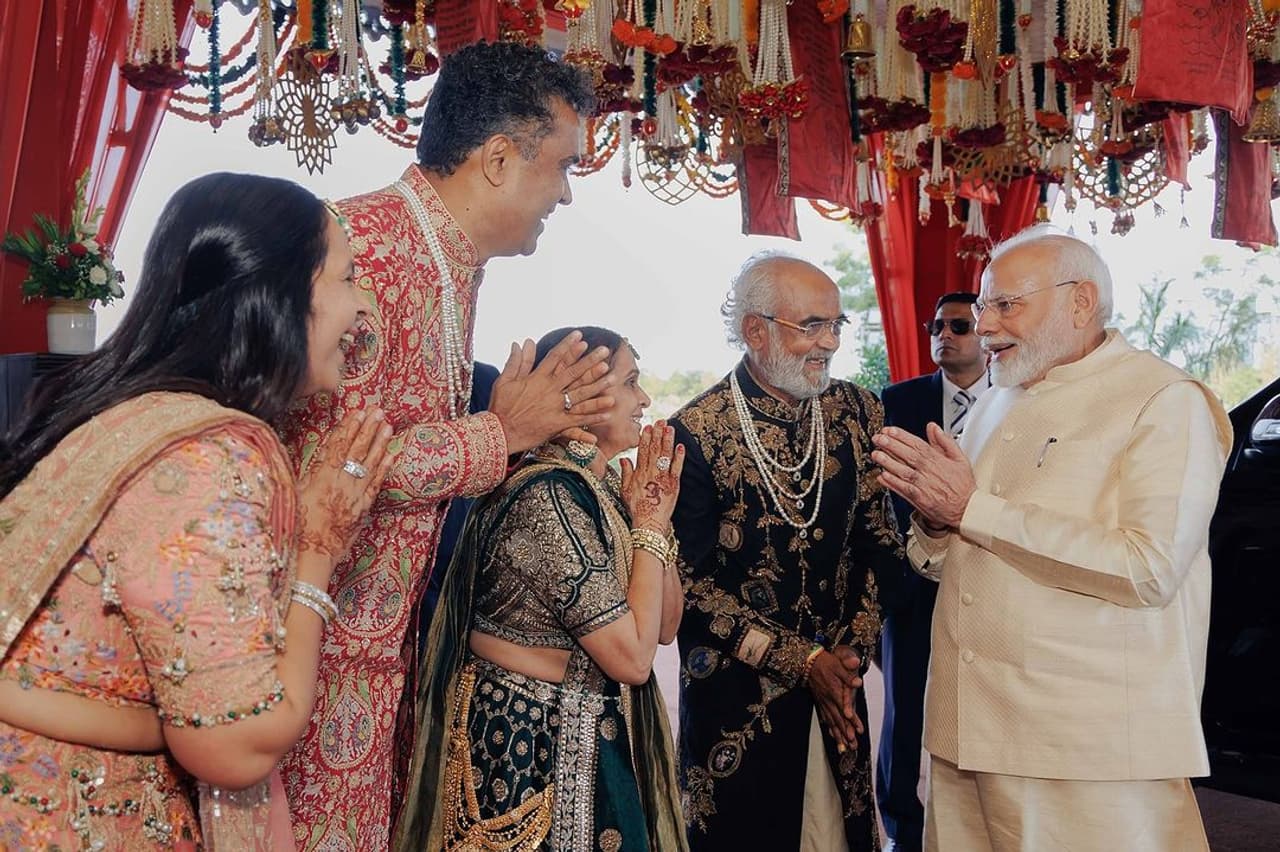 ಗುಜರಾತ್ ಪ್ರವಾಸದಲ್ಲಿರುವ ಪ್ರಧಾನಿ ನರೇಂದ್ರ ಮೋದಿ ವಜ್ರ ವ್ಯಾಪಾರಿ ಪುತ್ರನ ಮದುವೆಯಲ್ಲಿ ಪಾಲ್ಗೊಂಡಿದ್ದಾರೆ. ನವ ಜೋಡಿಗಳಿಗೆ ಆಶೀರ್ವದಿಸಿದ ಪ್ರಧಾನಿ ಮೋದಿ ಎಲ್ಲರ ಕೇಂದ್ರ ಬಿಂದುವಾಗಿದ್ದರು, ಇದು ಪ್ರಧಾನಿಯಾಗಿ ಮಾತ್ರವಲ್ಲ, ಮೋದಿಯ ಉಡುಗೆಗೆ ಭಾರಿ ಮೆಚ್ಚುಗೆ ವ್ಯಕ್ತವಾಗಿದೆ.