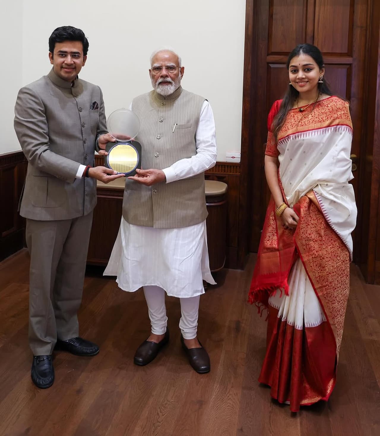 ಸಂಸದ ತೇಜಸ್ವಿ ಸೂರ್ಯ ಮತ್ತು ಪತ್ನಿ ಶಿವಶ್ರೀ ಪ್ರಧಾನಿ ಮೋದಿಯವರನ್ನು ಭೇಟಿಯಾಗಿ ಆಶೀರ್ವಾದ ಪಡೆದರು. ಈ ವೇಳೆ ಮೋದಿ ಅವರಿಗೆ ನವದಂಪತಿ ಒಂದು ವಿಶೇಷ ಉಡುಗೊರೆಯನ್ನು ನೀಡಿದ್ದು, ಅದರ ವಿಶೇಷತೆ ಏನೆಂದು ತಿಳಿದರೆ ನೀವು ಕೂಡ ಮೋದಿಯವರಂತೆ ಆಶ್ಚರ್ಯ ಪಡುತ್ತೀರಿ.