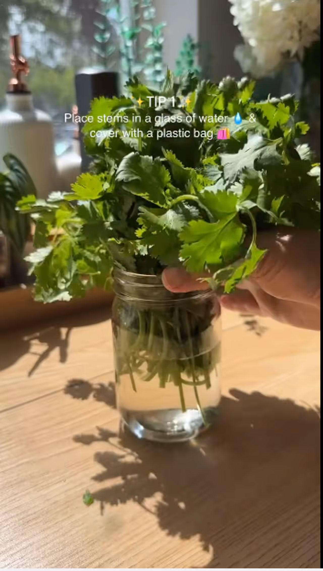 ನಿಮ್ಮ ಕೊತ್ತಂಬರಿ ಸೊಪ್ಪನ್ನು ಕೇವಲ ತರಕಾರಿಯಂತೆ ನೋಡಬೇಡಿ, ತಾಜಾ ಹೂವುಗಳಂತೆ ಭಾವಿಸಿ. ಒಂದು ಜಾರ್ ತೆಗೆದುಕೊಂಡು ಅದರಲ್ಲಿ ಒಂದು ಇಂಚಿನಷ್ಟು ನೀರು ತುಂಬಿಸಿ. ಈಗ ಕೊತ್ತಂಬರಿ ಕಟ್ಟಿನ ಕಾಂಡದ ತುದಿಗಳನ್ನು ಸ್ವಲ್ಪ ಕತ್ತರಿಸಿ, ಅದು ಹೆಚ್ಚು ಕಾಲ ತಾಜಾವಾಗಿರಲು ಆ ಜಾರ್ನಲ್ಲಿ ಇರಿಸಿ.