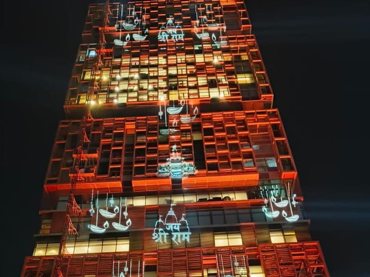 ರಿಲಯನ್ಸ್ ಇಂಡಸ್ಟ್ರೀಸ್ ಅಧ್ಯಕ್ಷ ಮುಕೇಶ್ ಅಂಬಾನಿ ಅವರ ಮುಂಬೈ ನಿವಾಸವು 'ಜೈ ಶ್ರೀ ರಾಮ್' ಕಲಾಕೃತಿಗಳಿಂದ ಬೆಳಗಿದೆ. ಸಂಪೂರ್ಣ ಬಂಗಲೆ ಬೆಳಕಿನಿಂದ ಝಗಮಗಿಸುತ್ತಿದೆ. ಲಕ್ಸುರಿಯಸ್ ಬಂಗಲೆ ಆಂಟಿಲಿಯಾ ಅಯೋಧ್ಯೆಯ ಸಂಭ್ರಮಕ್ಕೆ ಸಾಥ್ ನೀಡಿದೆ.