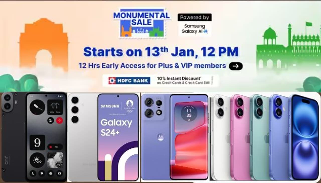 Samsung Galaxy S24+, Moto Edge 50 Pro, Nothing CMF Phone 1, ಮತ್ತು ಇತರವುಗಳನ್ನು ಒಳಗೊಂಡಂತೆ ಹಲವಾರು ಪ್ರಸಿದ್ಧ ಸ್ಮಾರ್ಟ್ಫೋನ್ಗಳ ಮೇಲಿನ ರಿಯಾಯಿತಿಗಳು ಮುಂದಿನ ವಾರದಿಂದ ಲಭ್ಯವಿರುತ್ತವೆ. ಗಣರಾಜ್ಯೋತ್ಸವದ ಸೇಲ್ ಸಮಾರಂಭದಲ್ಲಿ ಐಫೋನ್ 16, Pro, Plus, ಮತ್ತು Pro Max ನಲ್ಲಿ ನೀಡಲಾಗುವ ರಿಯಾಯಿತಿಗಳನ್ನು ಫ್ಲಿಪ್ಕಾರ್ಟ್ ಬಹಿರಂಗಪಡಿಸಿದೆ. ಆದರೂ ನಮಗೆ ಇನ್ನೂ ಪ್ರತಿಯೊಂದು ವಸ್ತುಗಳ ಬೆಲೆ ಮಾಹಿತಿ ಲಭ್ಯವಿಲ್ಲ. ಫ್ಲಿಪ್ಕಾರ್ಟ್ ಪ್ಲಸ್ ಚಂದಾದಾರಿಕೆಯನ್ನು ಹೊಂದಿರುವವರು ಜನವರಿ 14 ರಿಂದ ಪ್ರಾರಂಭವಾಗುವ ಒಂದು ದಿನ ಮುಂಚಿತವಾಗಿ ಪ್ರವೇಶವನ್ನು ಪಡೆಯುತ್ತಾರೆ. ಈಗಾಗಲೇ ಸಾರ್ವಜನಿಕಗೊಳಿಸಲಾಗಿರುವ ಕೆಲವು ಪ್ರಮುಖ ಕೊಡುಗೆಗಳು ಇಲ್ಲಿವೆ: