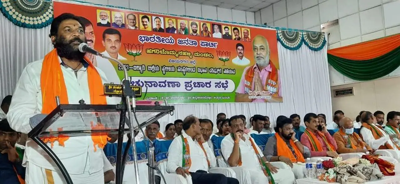 ಪಟ್ಟಣದ ಶ್ರೀಕನ್ನಿಕಾ ಪರಮೇಶ್ವರಿ ಕಲ್ಯಾಣ ಮಂಟಪದಲ್ಲಿ ಬಿಜೆಪಿ ಮಂಡಲ ವತಿಯಿಂದ ಗುರುವಾರ ಹಮ್ಮಿಕೊಂಡಿದ್ದ ವಿಧಾನ ಪರಿಷತ್ ಚುನಾವಣಾ(Vidhan Parishat Election) ಪ್ರಚಾರ(Campaign) ಸಭೆಯಲ್ಲಿ ಅಭ್ಯರ್ಥಿ ವೈ.ಎಂ. ಸತೀಶ್ ಪರ ಮತಯಾಚಿಸಿದ ಆನಂದ್ ಸಿಂಗ್