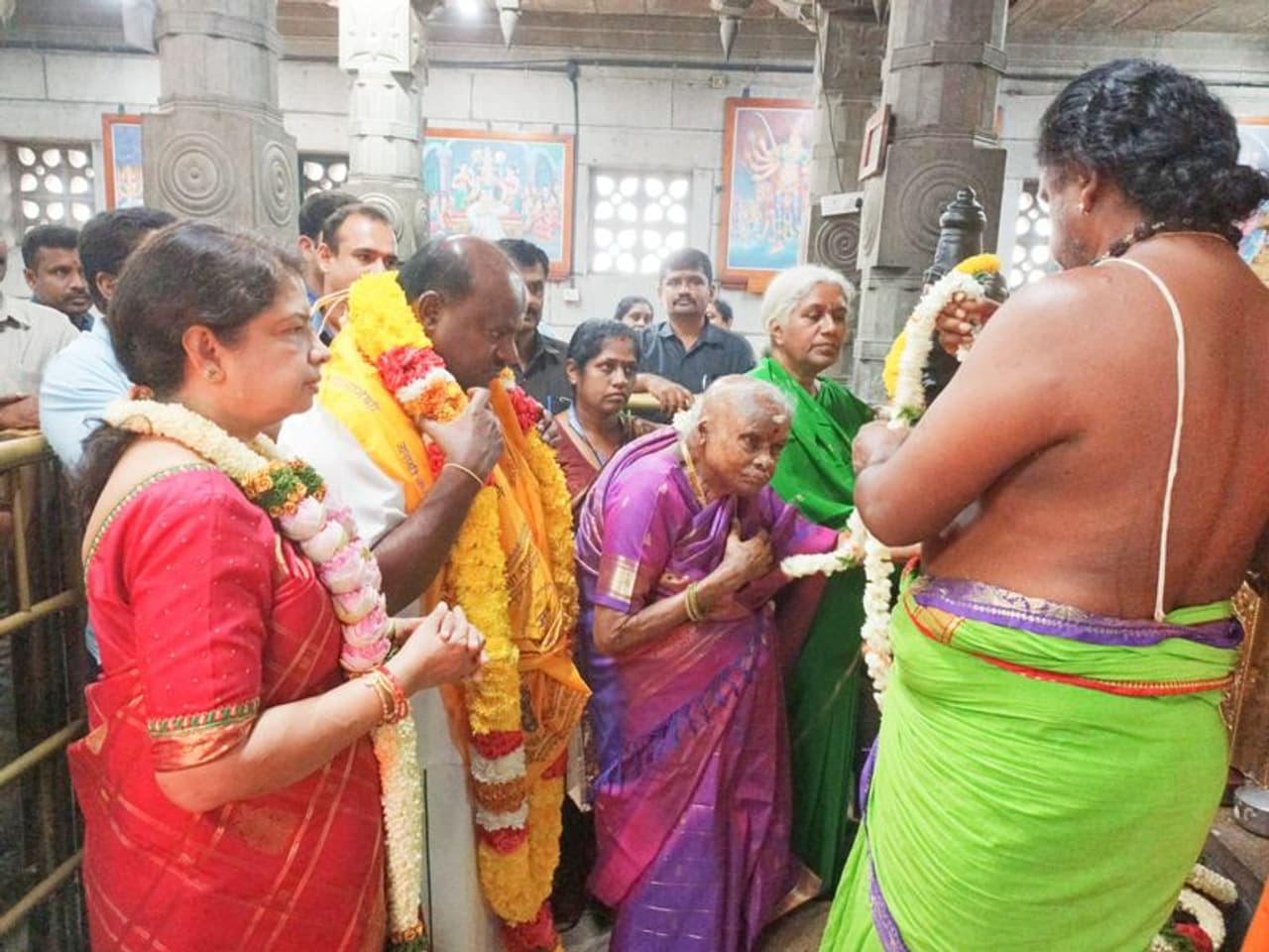 ತಾಯಿ ಚೆನ್ನಮ್ಮ, ಪತ್ನಿ ಅನಿತಾ ಕುಮಾರಸ್ವಾಮಿ ಜತೆ ರಾಜರಾಜೇಶ್ವರಿ ದೇವಿಗೆ ಕುಟುಂಬ ಸಮೇತ ಭೇಟಿ ನೀಡಿ ವಿಶೇಷ ಪೂಜೆ ಸಲ್ಲಿಸಿದ್ದಾರೆ.