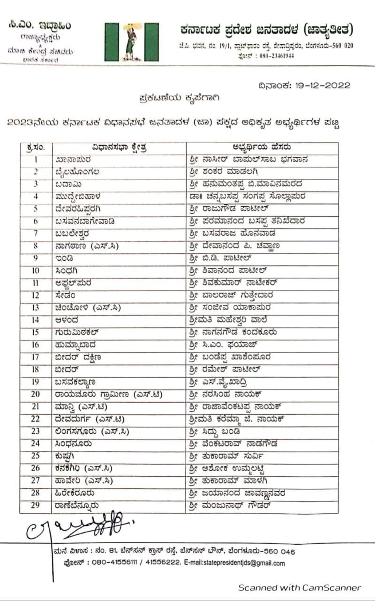 ಕರ್ನಾಟಕ ವಿಧಾನಸಭೆ ಚುನಾವಣೆಯ ಹಿನ್ನೆಲೆಯಲ್ಲಿ ಜೆಡಿಎಸ್ ರಾಜ್ಯಾಧ್ಯಕ್ಷ ಸಿ.ಎಂ. ಇಬ್ರಾಹಿಂ ಮತ್ತು ಮಾಜಿ ಮುಖ್ಯಮಂತ್ರಿ ಎಚ್.ಡಿ. ಕುಮಾರಸ್ವಾಮಿ ಅವರು ರಾಜ್ಯದ 93 ವಿಧಾನಸಭಾ ಕ್ಷೇತ್ರಗಳ ಜೆಡಿಎಸ್ ಅಭ್ಯರ್ಥಿಗಳ ಪಟ್ಟಿಯನ್ನು ಬಿಡುಗಡೆ ಮಾಡಿದ್ದಾರೆ.