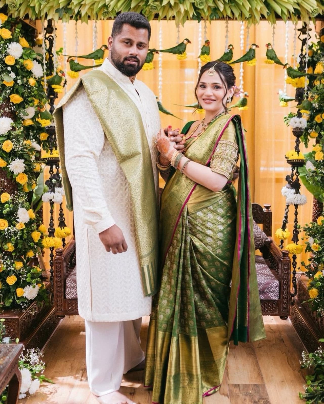 ಹಸಿರು ರೇಶ್ಮೆ ಸೀರೆಯಲ್ಲಿ ಅವಿವಾ ಮಿಂಚಿದ್ದಾರೆ, ಪಕ್ಕದಲ್ಲಿ ವೈಟ್ ಶೇರ್ವಾನಿ ಅದಕ್ಕೆ ಹಸಿರು ಶಾಲ್ ಧರಿಸಿ ಅಭಿಷೇಕ್ ಅಂಬರೀಶ್ ಕಾಣಿಸಿಕೊಂಡಿದ್ದಾರೆ.