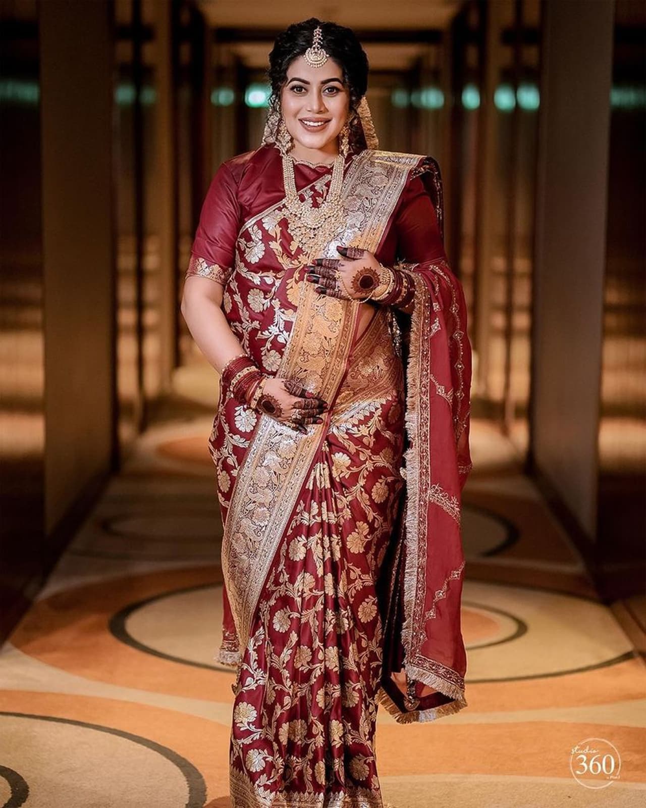 ಕೆಂಪು ಬಣ್ಣದ ರೇಶ್ಮೆ ಸೀರಿಯನ್ನು ಪೂರ್ಣಾ ಧರಿಸಿದ್ದಾರೆ. ಸಿಲ್ವರ್ ಜರಿ ಇರುವ ಈ ಸೀರೆ ನೋಡಲು ಸಖತ್ ಟ್ರೆಂಡಿಯಾಗಿ. ಪೂರ್ಣಾ ಗ್ಲೋ ಆಗುತ್ತಿದ್ದಾರೆ.