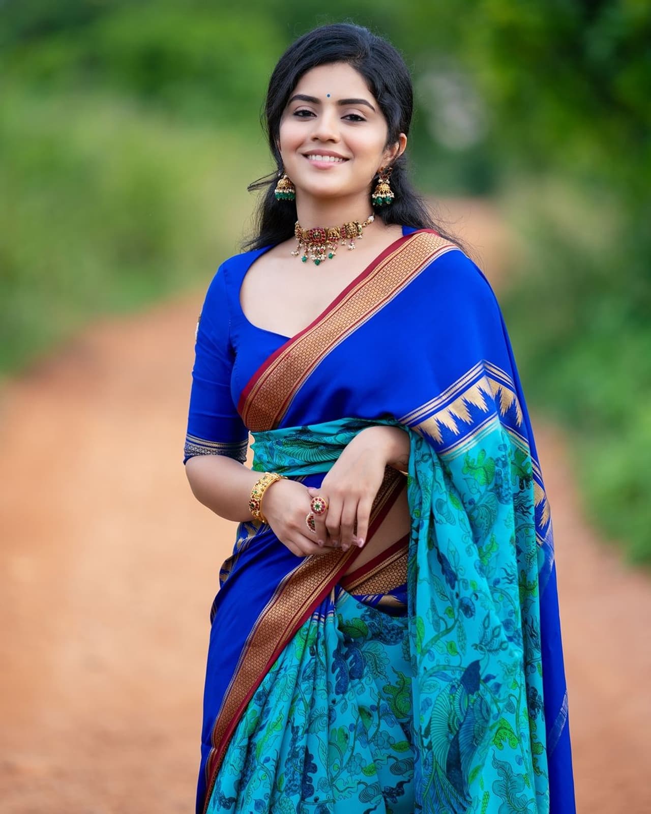 ಮೇಘಾ ಶೆಟ್ಟಿ ಇದೀಗ ಸಾಂಪ್ರದಾಯಿಕ ಶೈಲಿಯಲ್ಲಿ ನೀಲಿ ಸೀರೆಯುಟ್ಟು ಫೋಟೋಶೂಟ್ ಮಾಡಿಸಿದ್ದಾರೆ. ಜೊತೆಗೆ ಅವರು ತೊಟ್ಟ ನೆಕ್ಲೇಸ್, ಕಿವಿಯೊಲೆ, ಸರಳವಾದ ಮೇಕಪ್ ಸಖತ್ ಹೈಲೈಟ್ ಆಗಿದೆ.