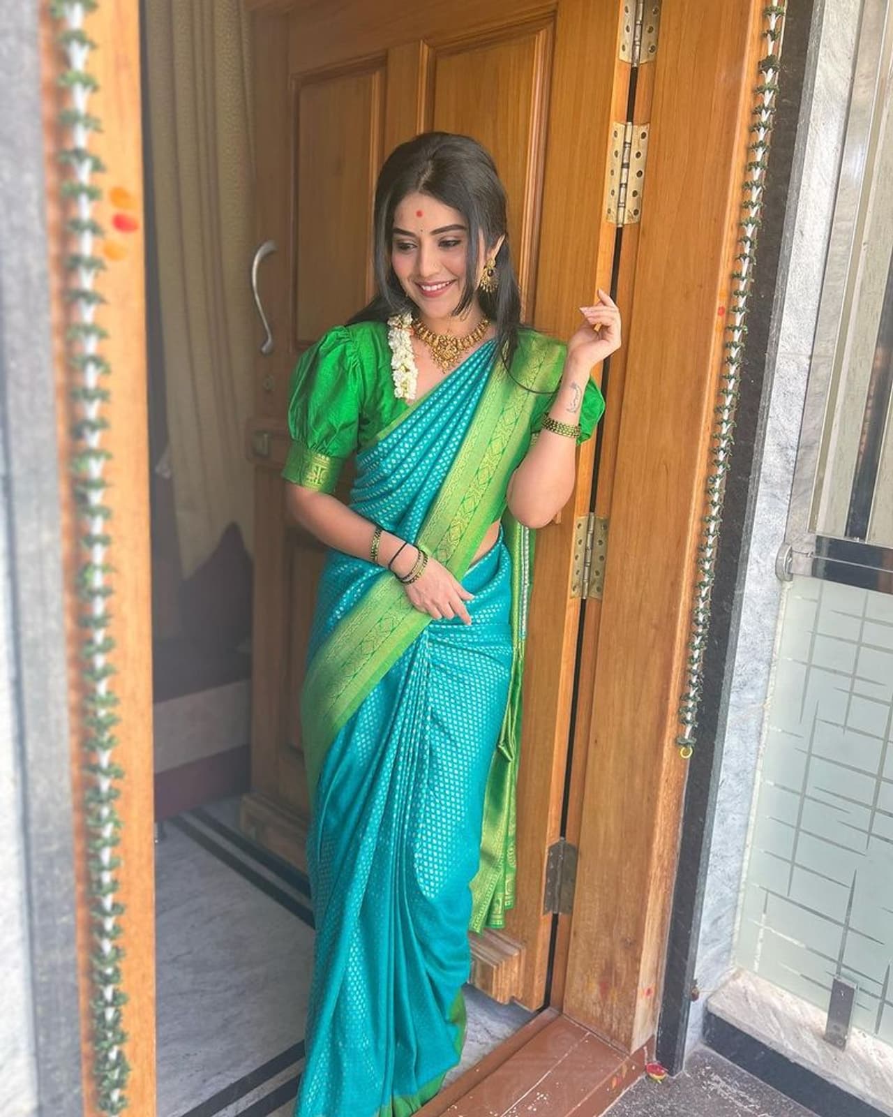 ರಾಮ ಗ್ರೀನ್ ಹಾಗೂ ಗ್ರೀನ್ ಬಾರ್ಡರ್ ಸೀರೆಯುಟ್ಟ ಮೇಘಾ ಶೆಟ್ಟಿ ಮಲ್ಲಿಗೆ ಹೂವನ್ನು ಮುಡಿದಿದ್ದಾರೆ. ಜೊತೆಗೆ ಹಣೆಗೆ ಕುಂಕುಮ ಇಟ್ಟುಕೊಂಡು ಮನೆಯ ಬಾಗಿಲಿನಲ್ಲಿ ನಿಂತು ಫೋಟೋಗಳಿಗೆ ಪೋಸ್ ಕೊಟ್ಟಿದ್ದಾರೆ.