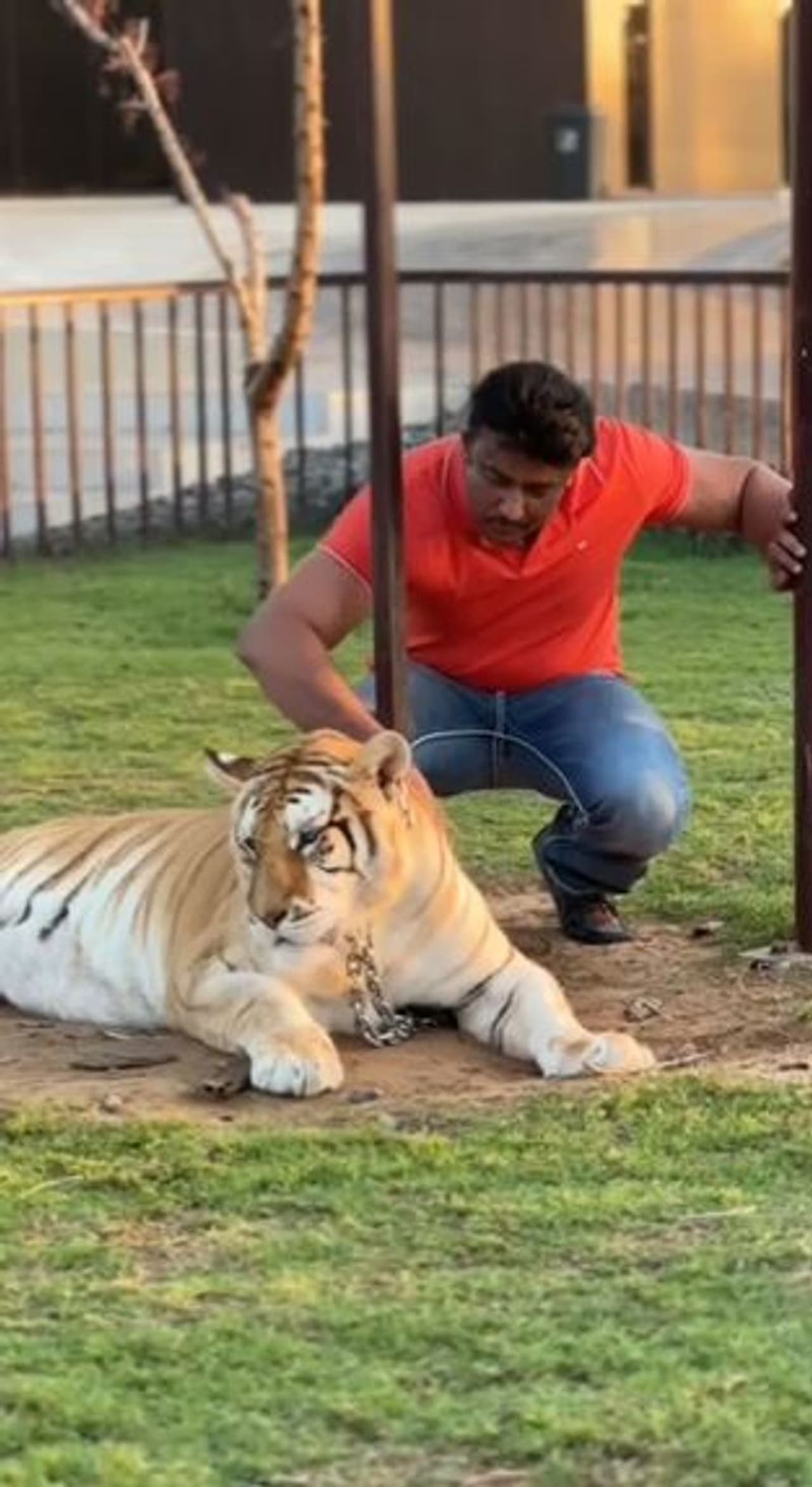 ದುಬೈನಲ್ಲಿರುವ ಟ್ರೈನಿಂಗ್ ಹುಲಿಯನ್ನು ದರ್ಶನ್ ಮುದ್ದಾಡಿದ್ದಾರೆ. ಯಾವುದೇ ಭಯವಿಲ್ಲ ಅಲ್ಲಿನ ಹಾವುಗಳನ್ನು ಕುತ್ತಿಗೆ ಸುತ್ತಾ ಧರಿಸಿ ಫೋಟೋಗೆ ಸ್ಮೈಲ್ ಮಾಡಿದ್ದಾರೆ.