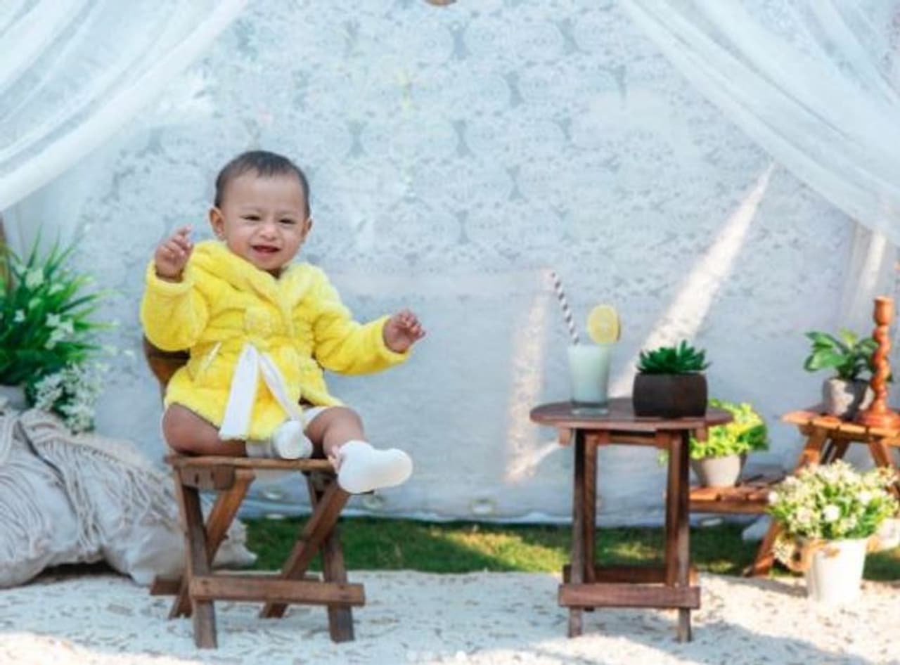 ಮನೆ ಗಾರ್ಡನ್ನಲ್ಲಿ ಬ್ಯಾಕ್ಡ್ರಾಪ್ಗಳನ್ನು ಬಳಸುತ್ತಾರೆ. ವೈಟ್ ಸೆಟ್ ಮುಂದೆ ಜ್ಯೂಸ್ ಟೇಬಲ್ ಇಟ್ಟು ಮಕ್ಕಳಿಬ್ಬರು ಪೋಸ್ ಕೊಟ್ಟಿದ್ದಾರೆ.