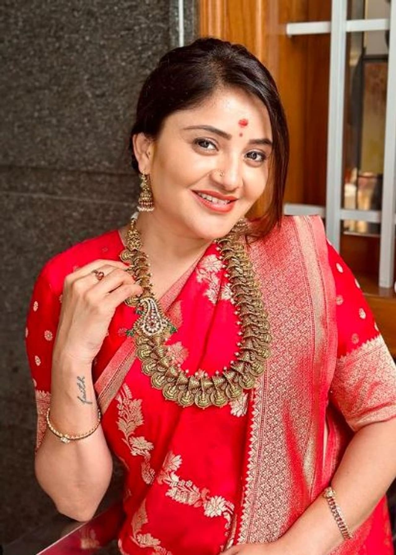 ಹೌದು! ಕೆಂಪು ಬಣ್ಣದ ಡಿಸೈನರ್ ಸೀರೆಗೆ ಕಾರುಣ್ಯ ರಾಮ್ ಅಭೂಷಣ್ ಅಂಗಡಿಯ ಆಭರಣ ಧರಿಸಿದ್ದರು. ನೆಟ್ಟಿಗರ ಕಣ್ಣು ಆ ನೆಕ್ಲೆಸ್ ಮೇಲಿದೆ.