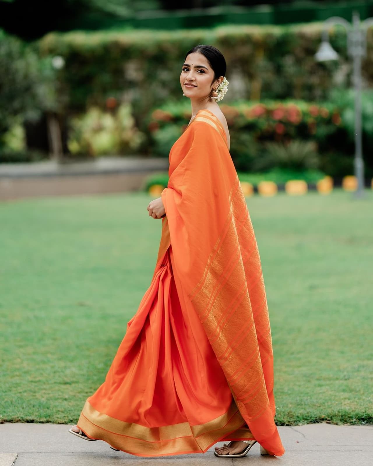 ಸಾಂಸ್ಕೃತಿಕ ನಗರಿ ಮೈಸೂರಿನಲ್ಲಿ ರುಕ್ಮಿಣಿ ತುಂಬಾನೆ ಟ್ರೆಡಿಶನ್ ಲುಕ್ ನಲ್ಲಿ ಕಾಣಿಸಿಕೊಂಡಿದ್ದರು. ಆರೇಂಜ್ ಬಣ್ಣದ ಸೀರೆಯುಟ್ಟು, ಕಿವಿಗೆ ಜುಮ್ಕಿ, ತಲೆ ತುಂಬಾ ದುಂಡು ಮಲ್ಲಿಗೆ ಹೂವು, ಸೊಂಟ ಪಟ್ಟಿ ಧರಿಸಿ ತುಂಬಾನೆ ಮುದ್ದಾಗಿ ಕಾಣಿಸಿಕೊಂಡಿದ್ದಾರೆ.