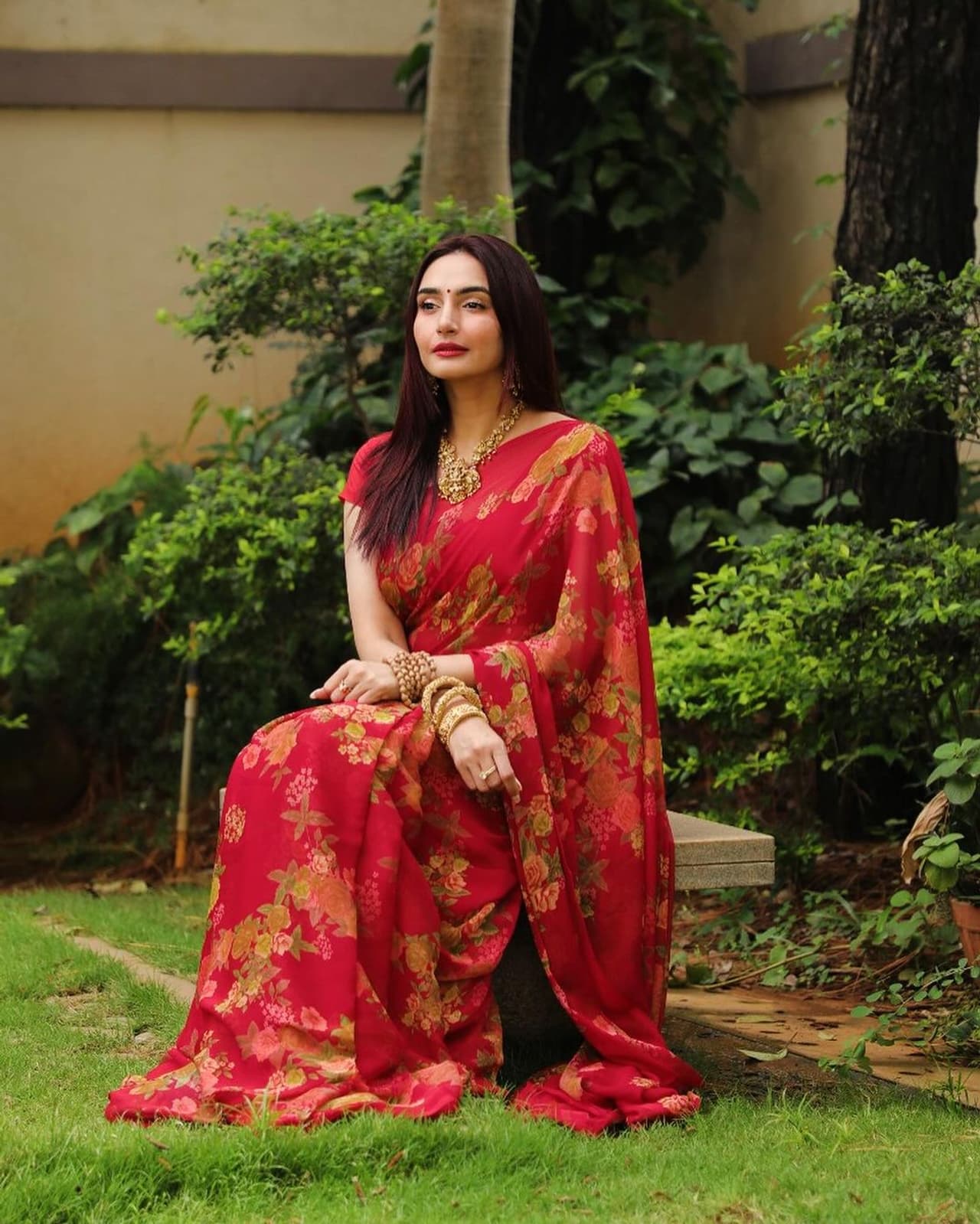 ಹೌದು ರಾಗಿಣಿ ದ್ವಿವೇದಿ ಫ್ಲೋರಲ್ ಡಿಸೈನ್ ಇರುವಂತಹ ಕೆಂಪು ಬಣ್ಣದ ಸುಂದರವಾದ ಸೀರೆ ಧರಿಸಿದ್ದು, ಸಂಪೂರ್ಣವಾಗಿ ಟ್ರೆಡಿಶನಲ್ ಅವತಾರದಲ್ಲಿ ಕಾಣಿಸಿಕೊಂಡಿದ್ದಾರೆ. ಕೈ ತುಂಬಾ ಚಿನ್ನದ ಬಳೆ, ಕತ್ತಿನಲ್ಲಿ ಆಂಟಿಕ್ ನೆಕ್ಲೆಸ್ ಧರಿಸಿ, ಹೂನಗು ಚೆಲ್ಲಿ ಪೋಸ್ ನೀಡಿದ್ದಾರೆ.
